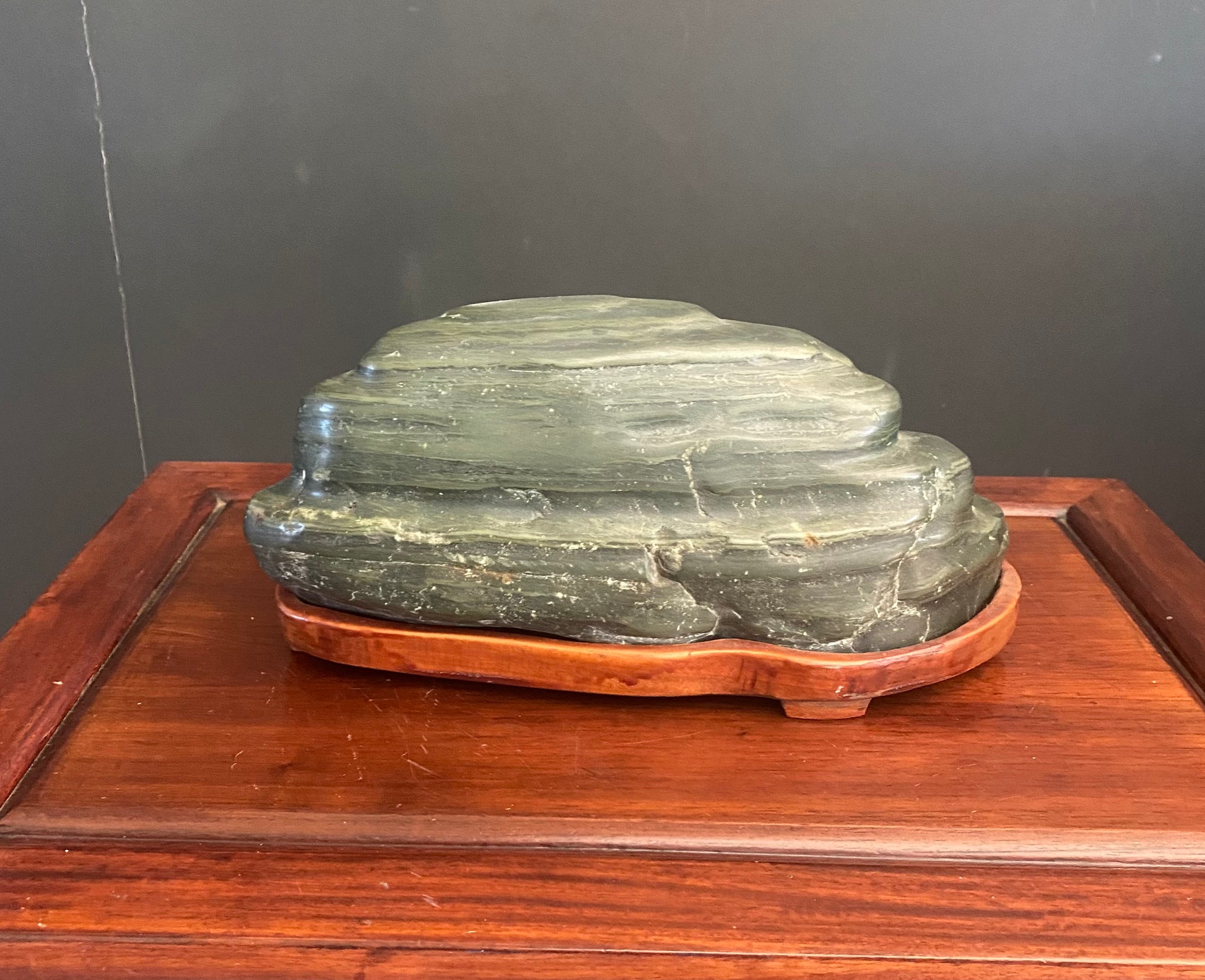 Japanese Suiseki stone also known as scholar viewing stone with original wooden base. From mid Showa period