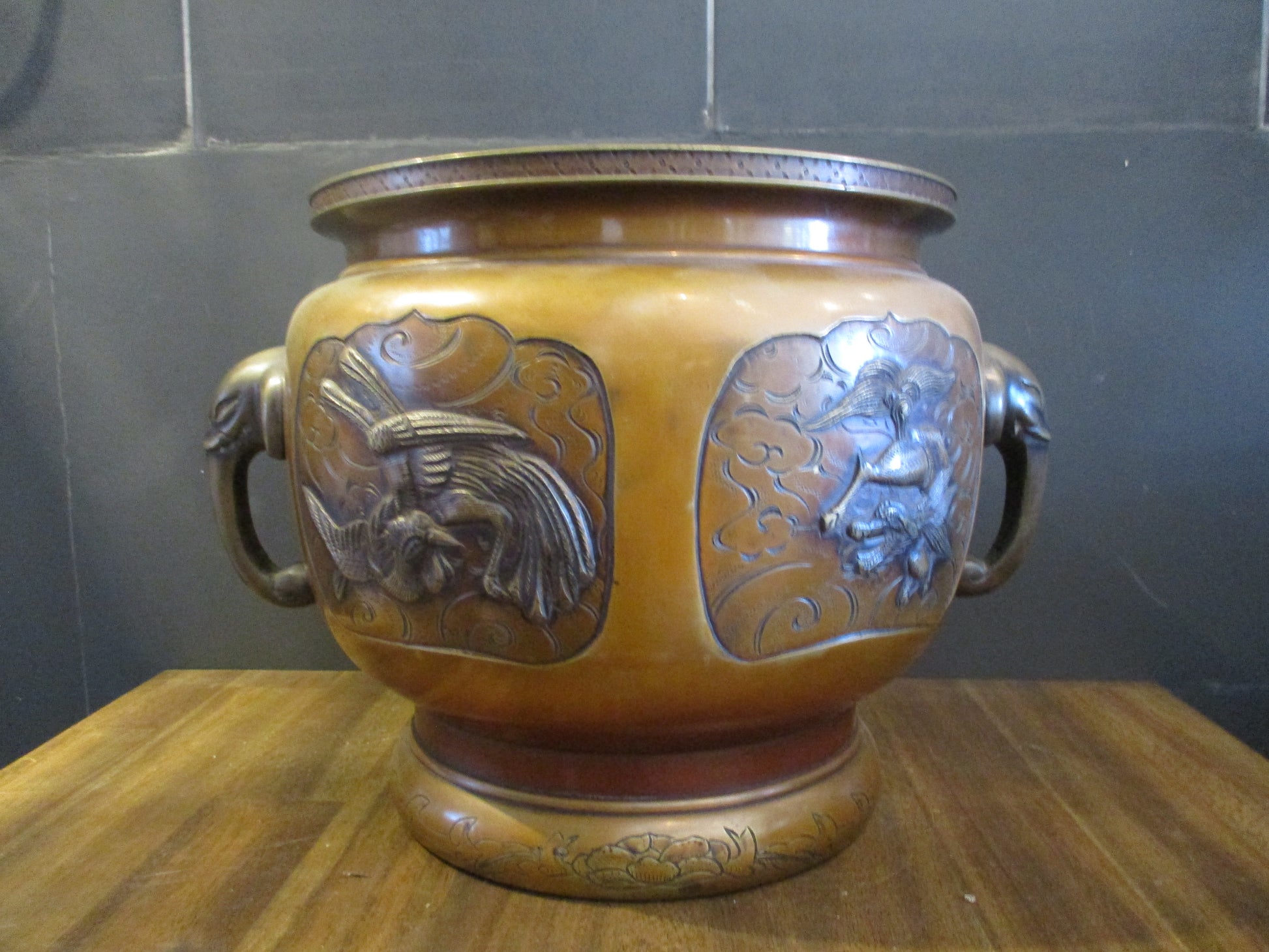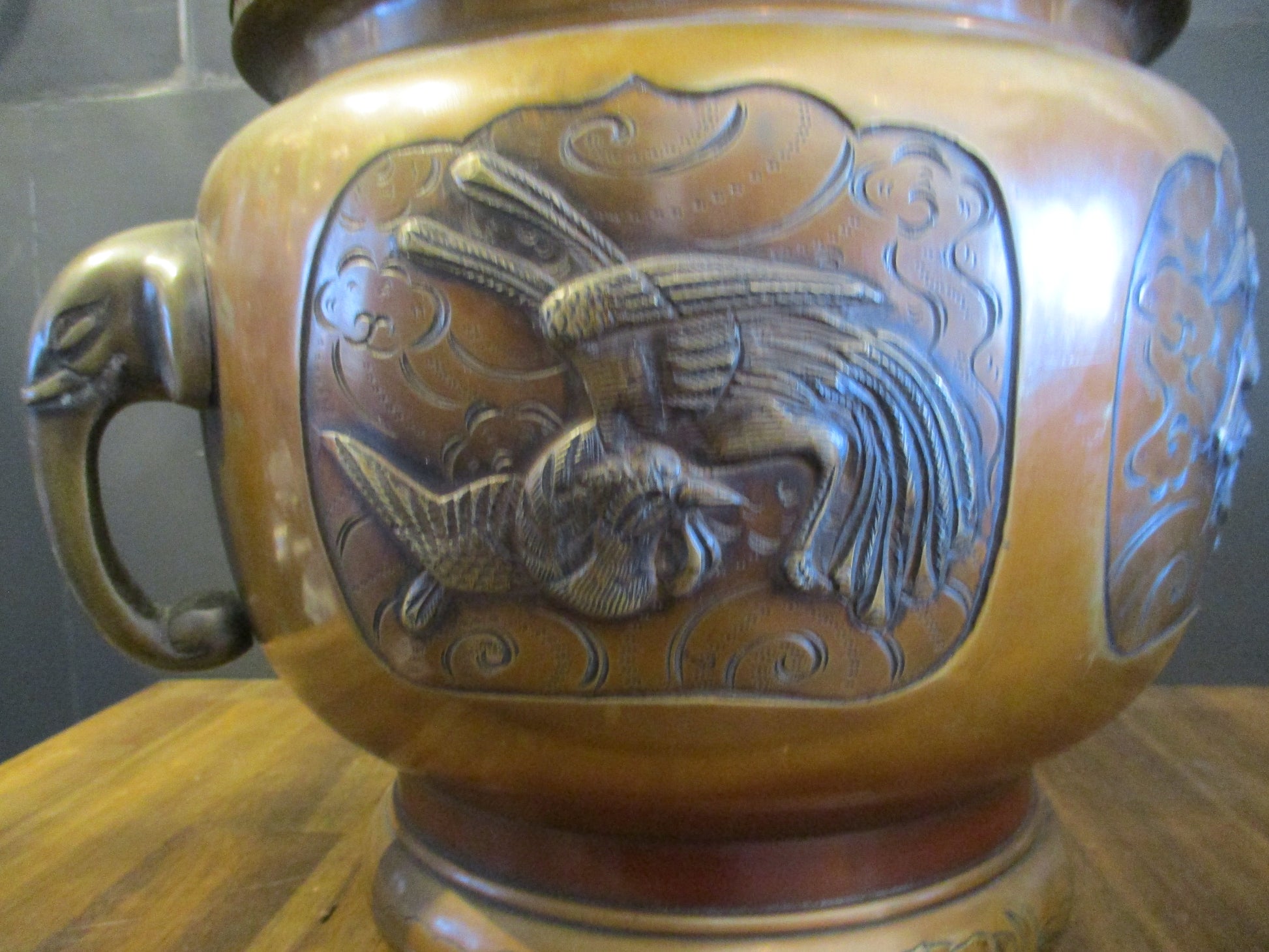 Pair of Japanese Bronze Hibachi depicting four different scenes Dragon, turtle, Rooster and Shi-Shi dog from Taisho Period.