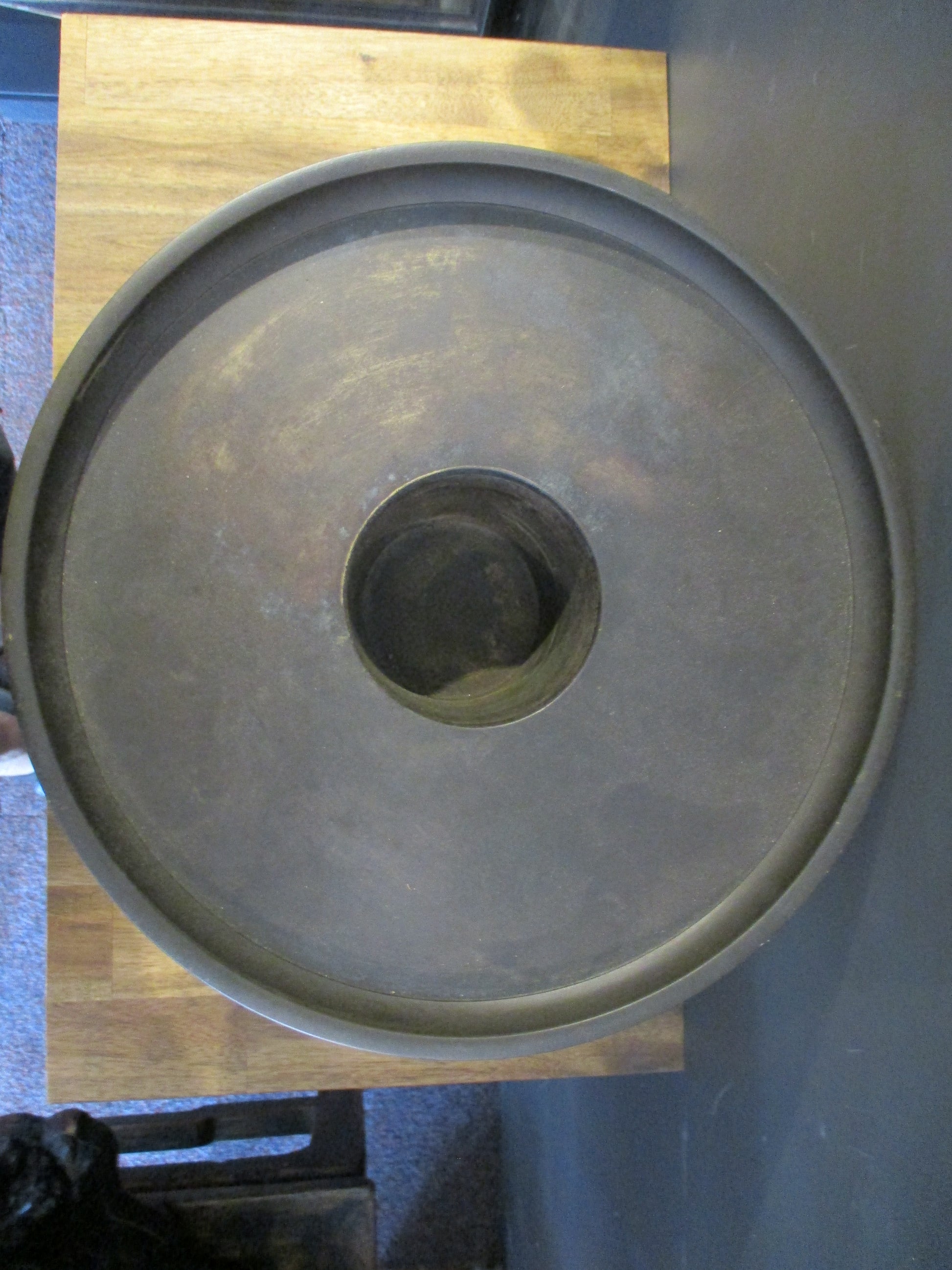 Japanese Bronze Ikebana vase and tray with a village and mountain scene and Elephant shaped handles.