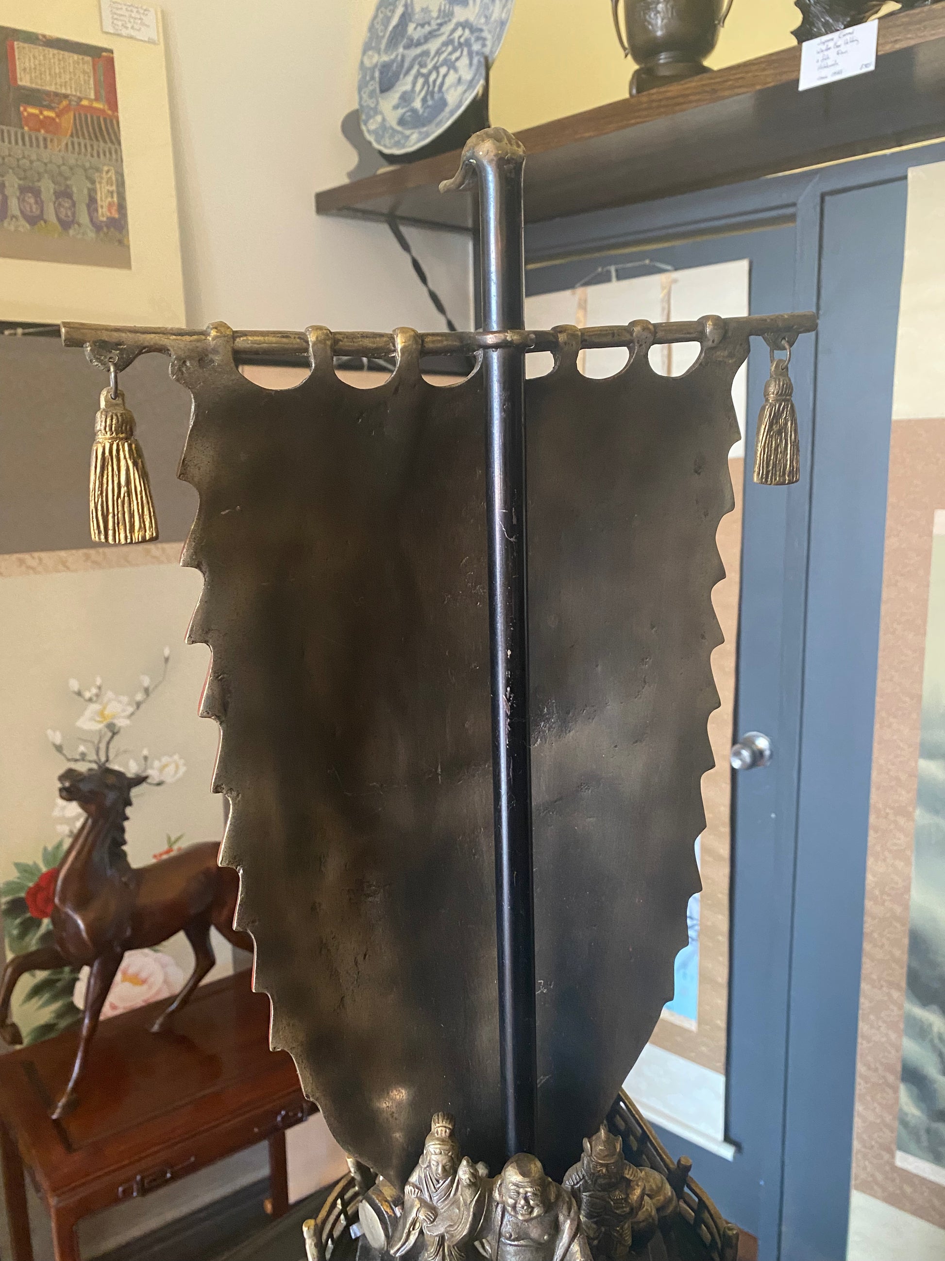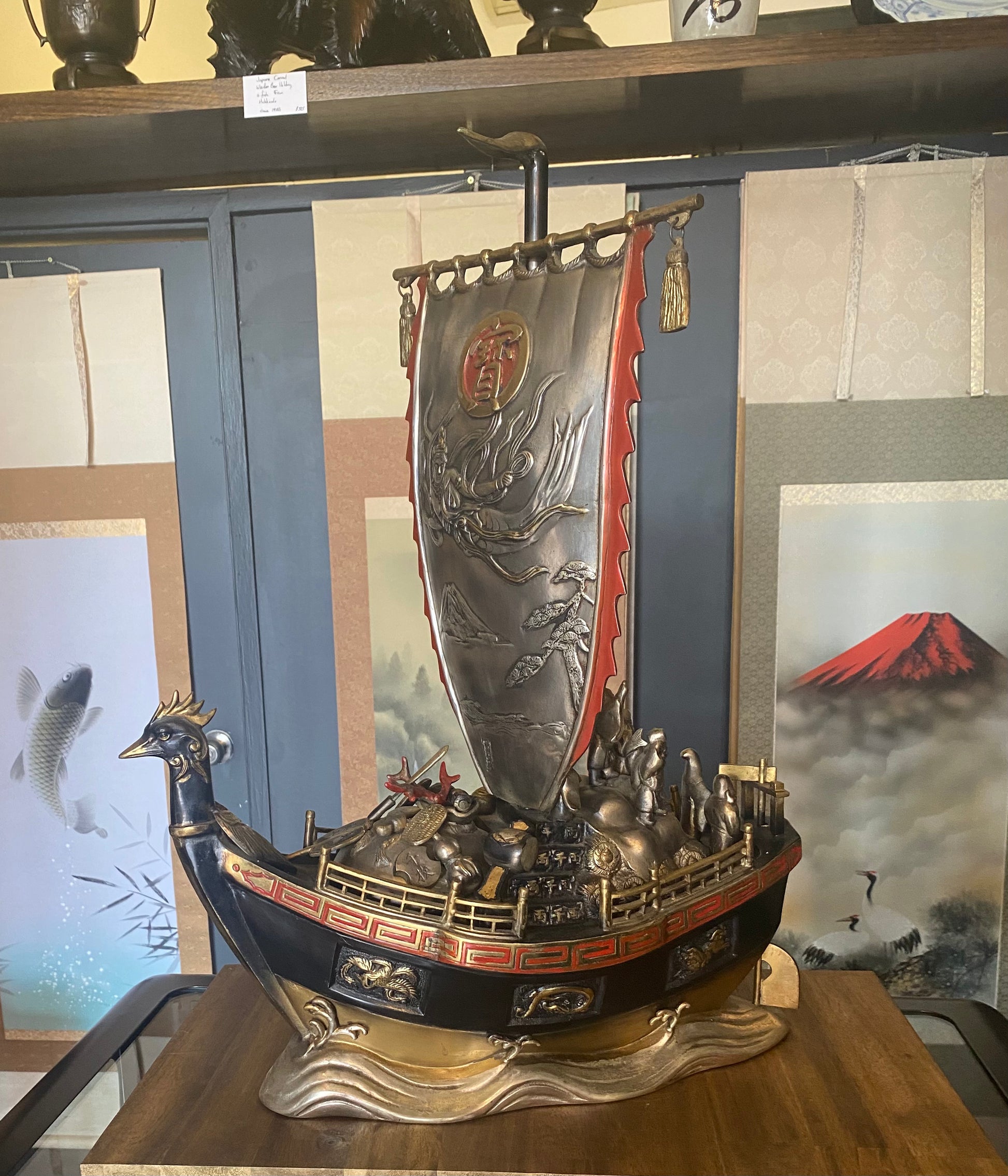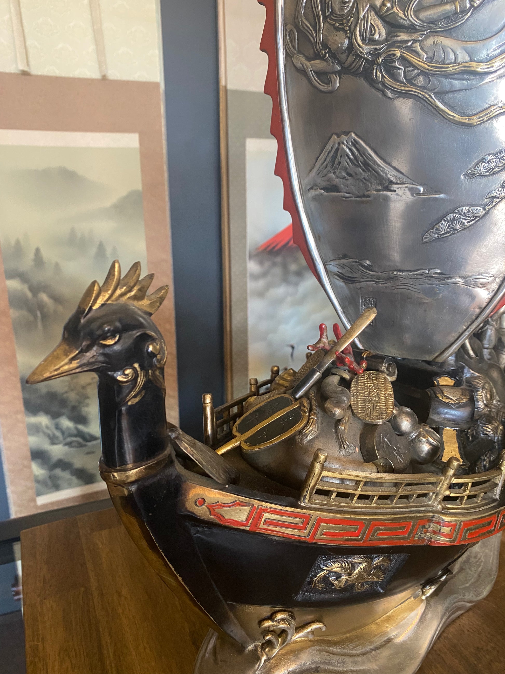 Outstanding Japanese silvered and painted bronze Okimono treasure ship (Takarabune) with seven gods of good fortune from late Taisho period-early Showa period. SIgned circa 1920-30s