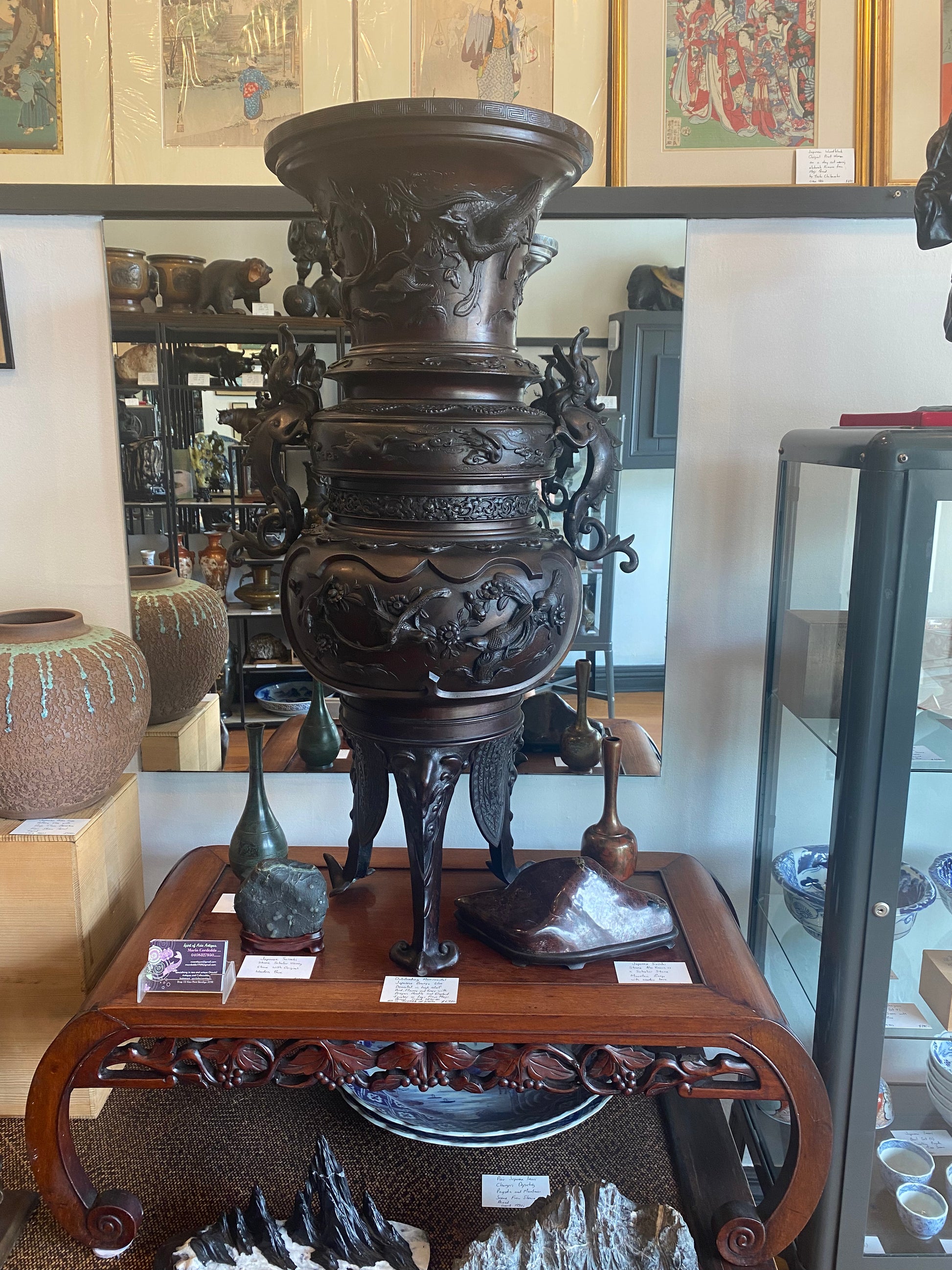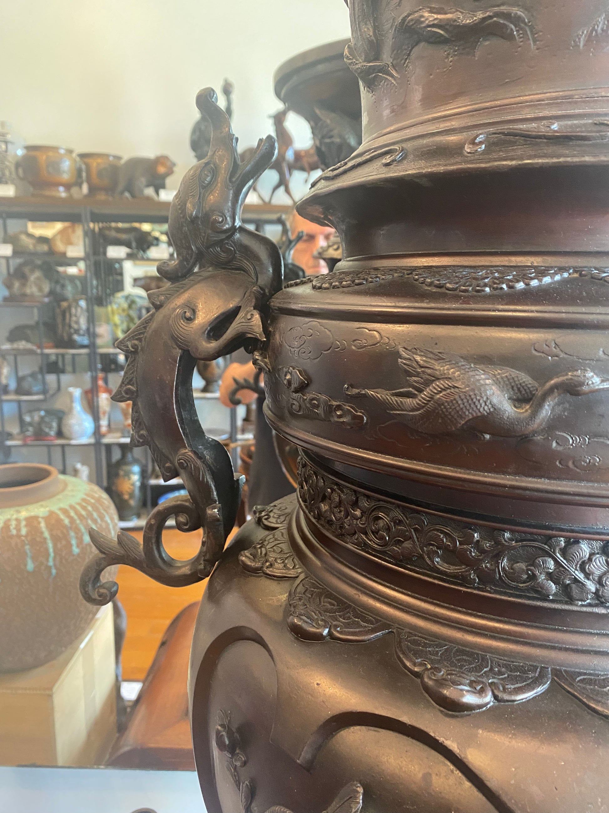 Outstanding monumental Japanese bronze urn decorated in high relief bird, flowers and trees with dragon handle and elephant trunks as legs from Meiji period circa 1870-80. Attribute to Yoshida of Kyoto.