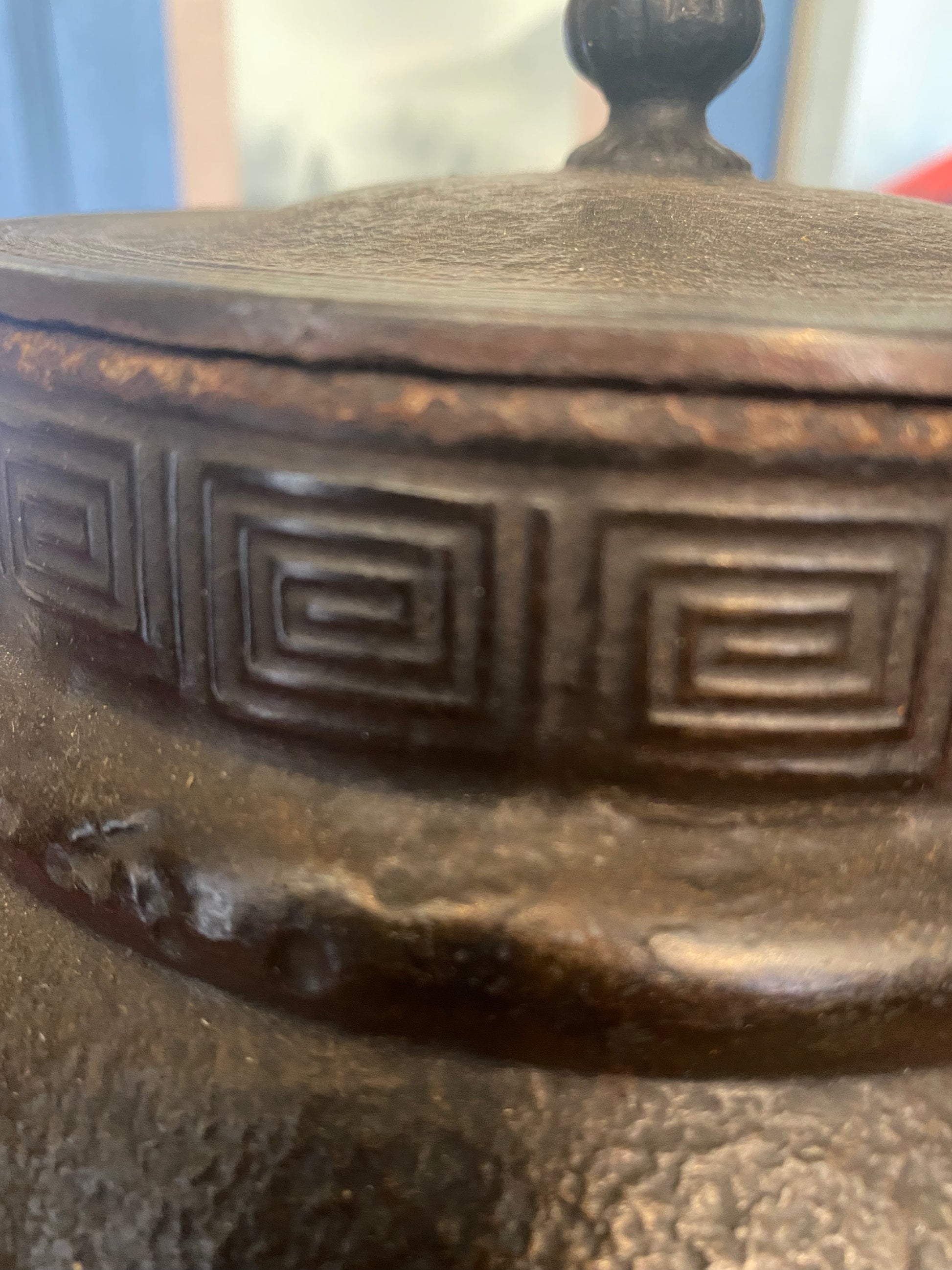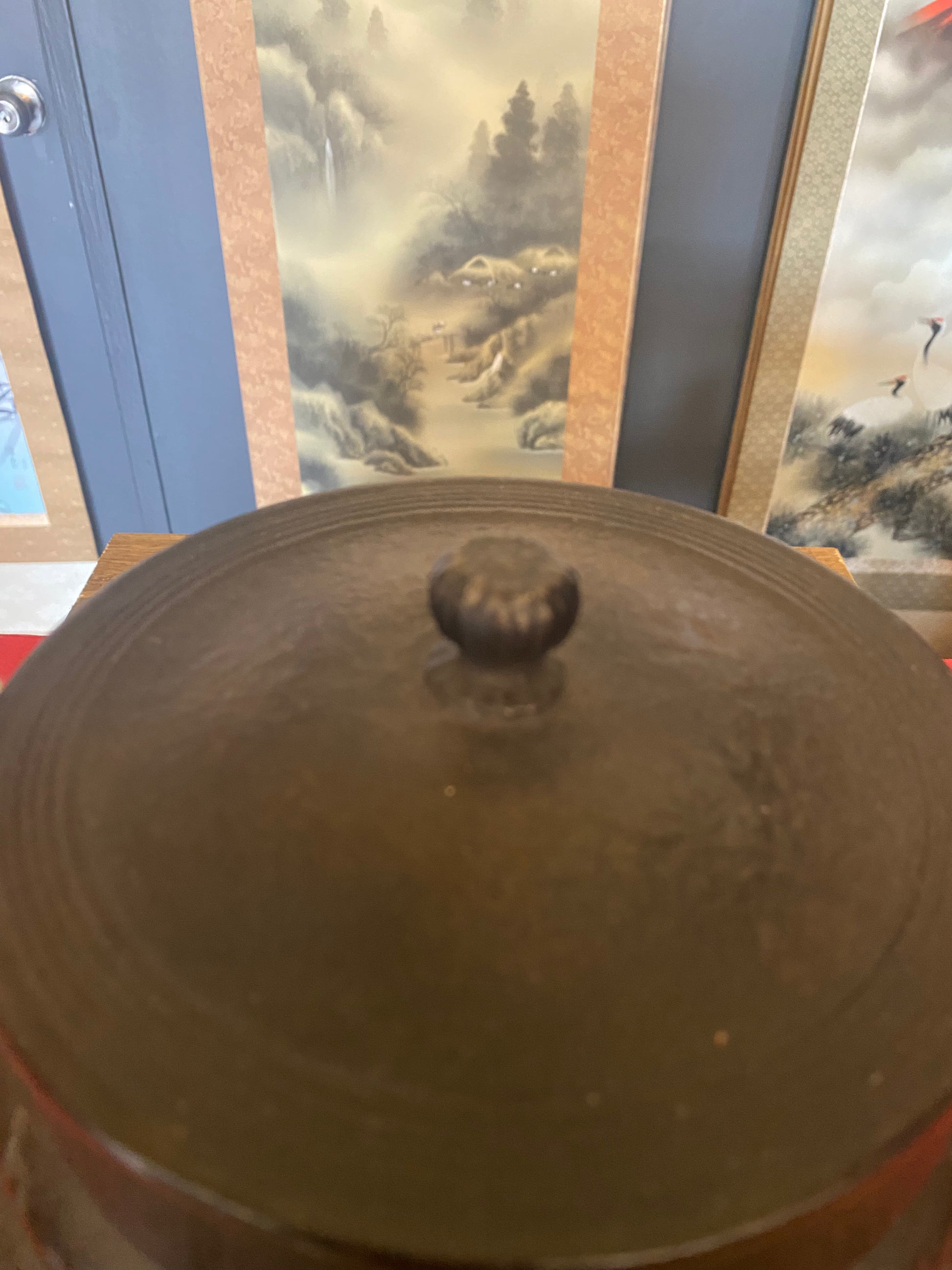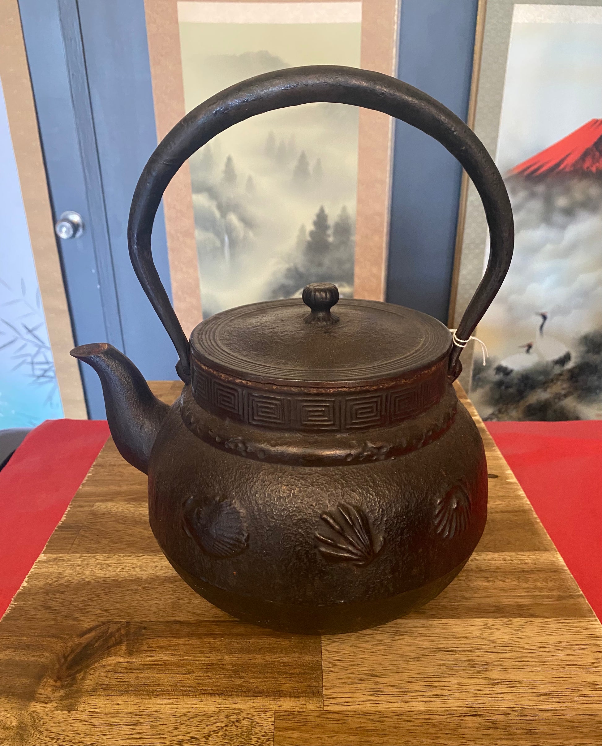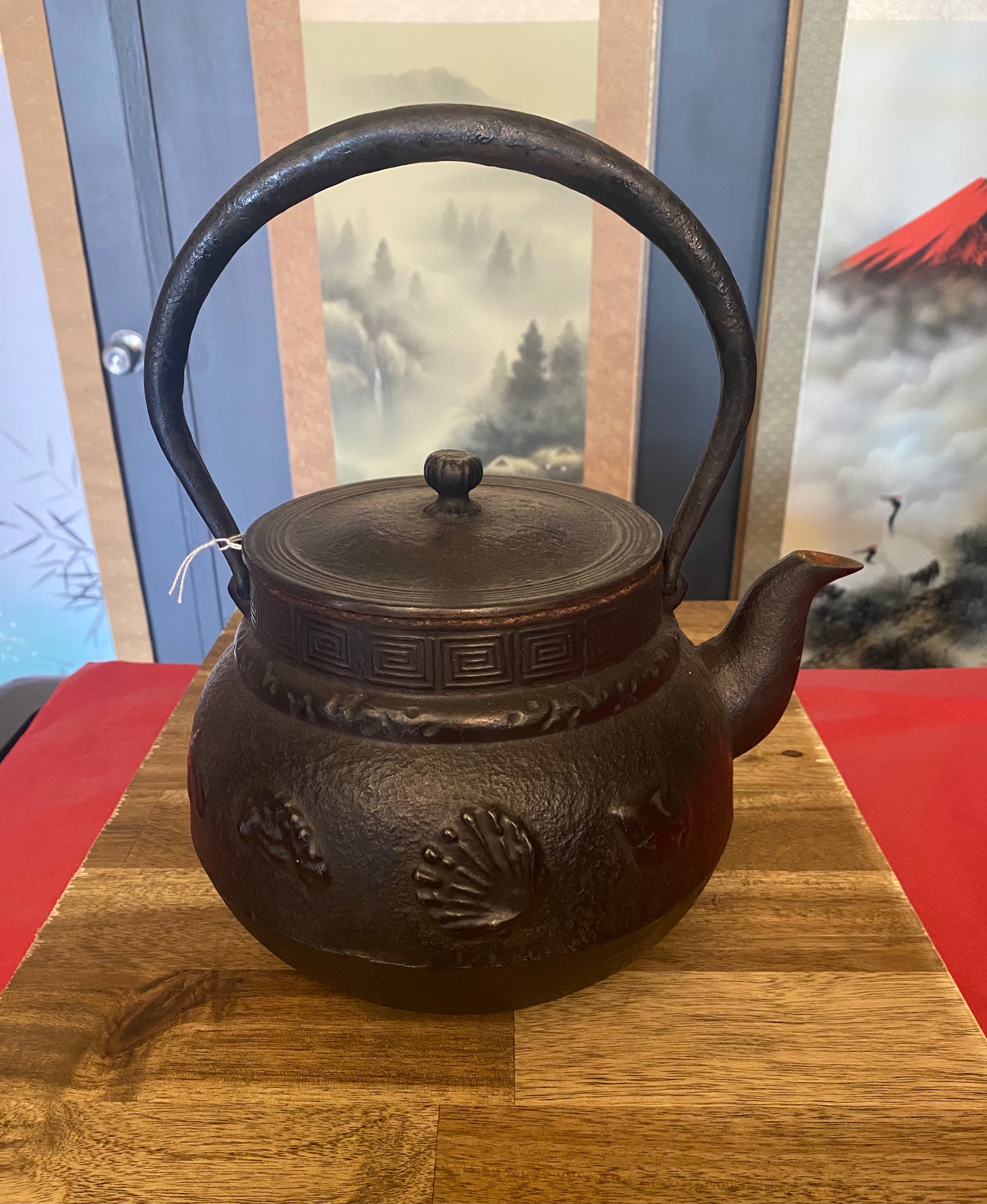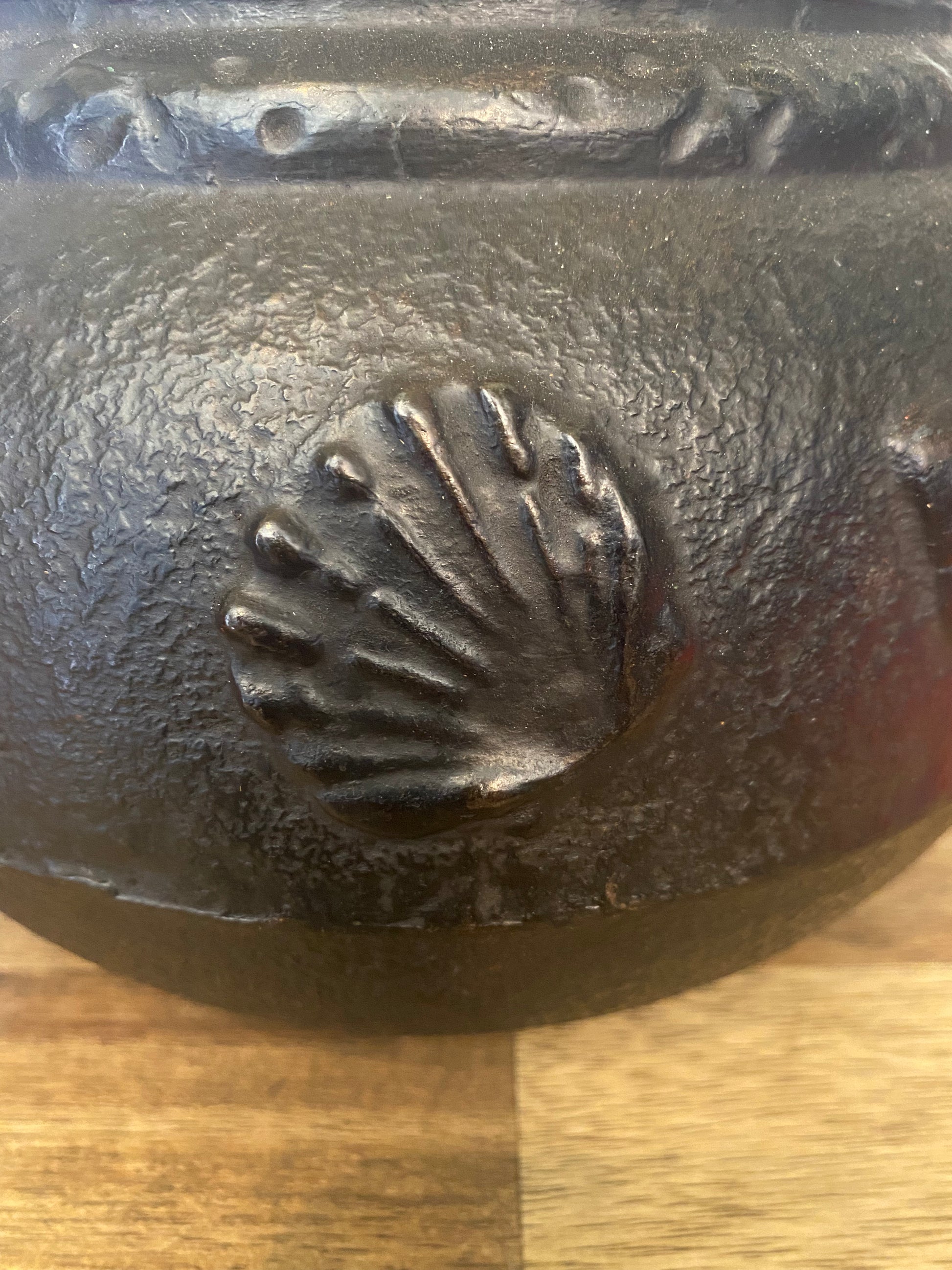 Japanese cast iron kettle with sea shells from Showa period. Signed circa 1960s.
