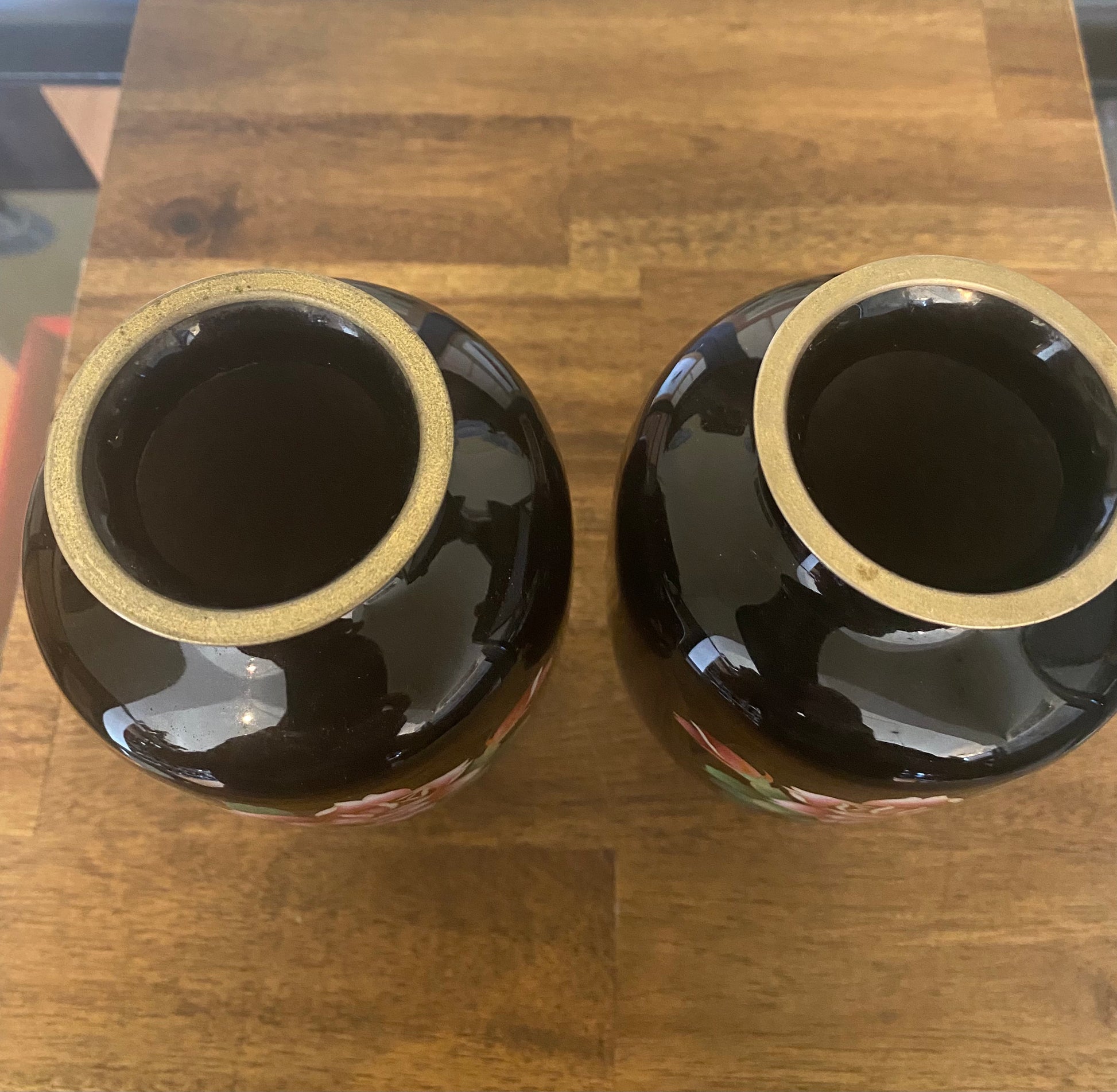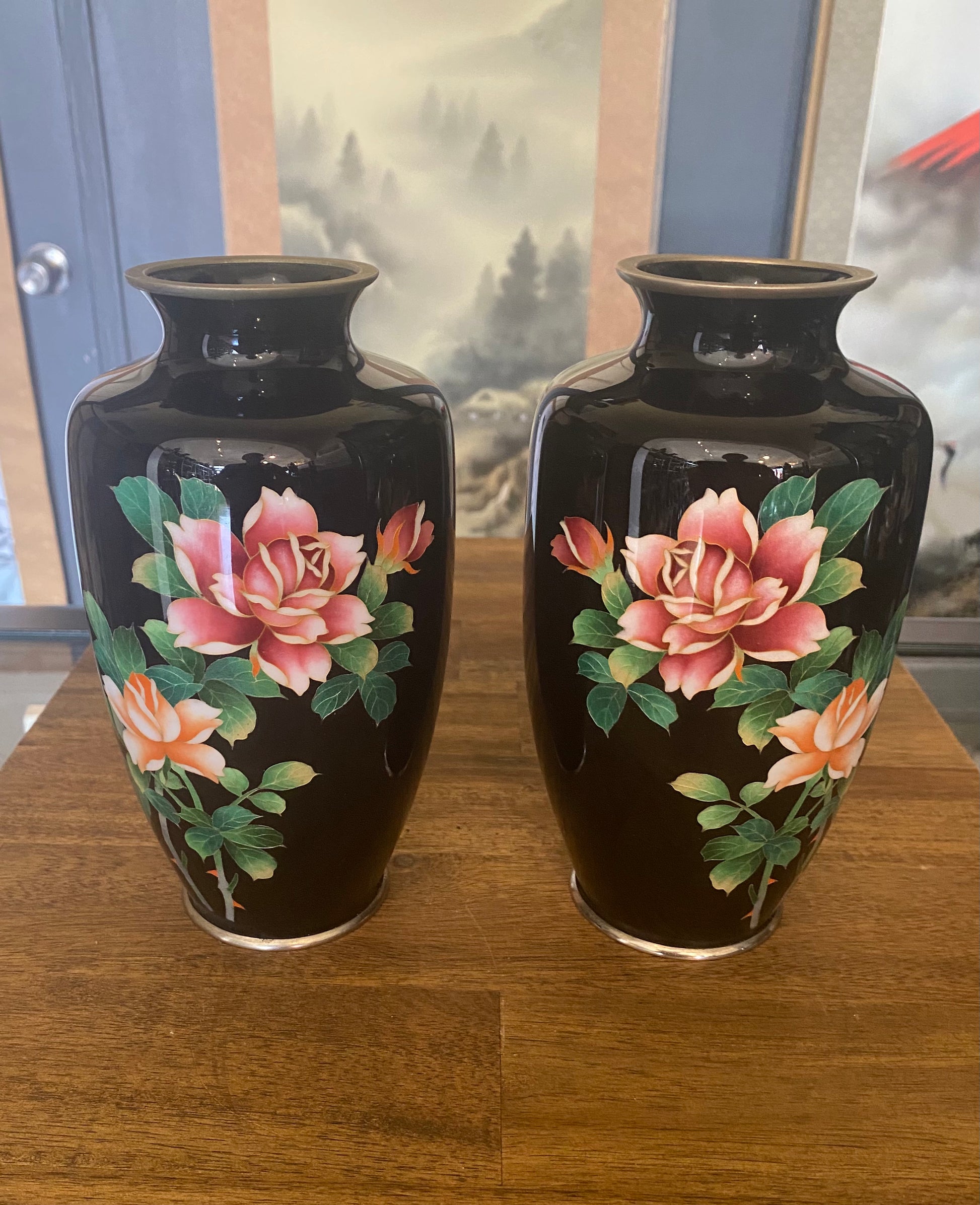 Pair of Japanese Cloisonne vases depicting roses on a black grounf from early Showa period. Circa 1930s.