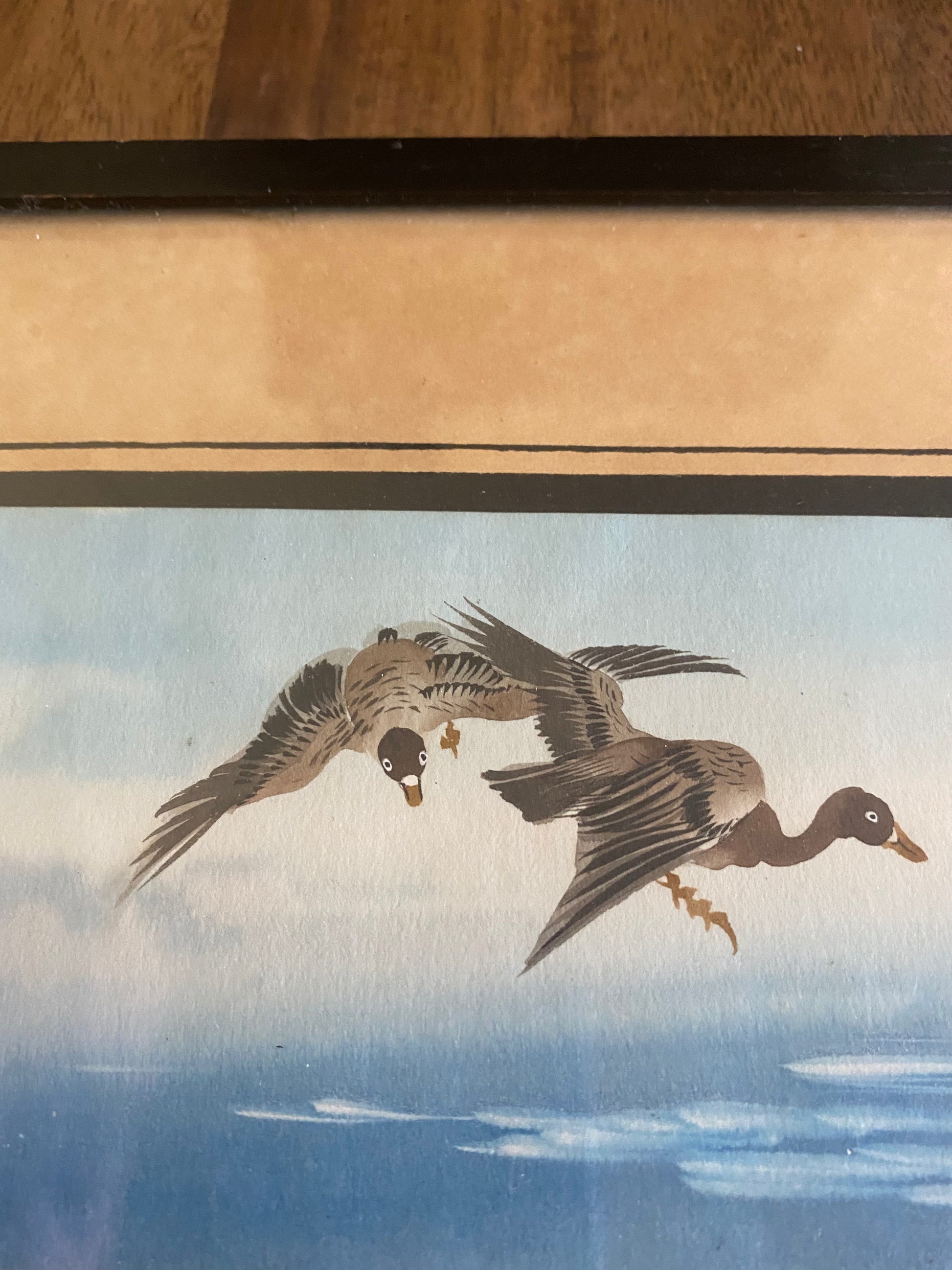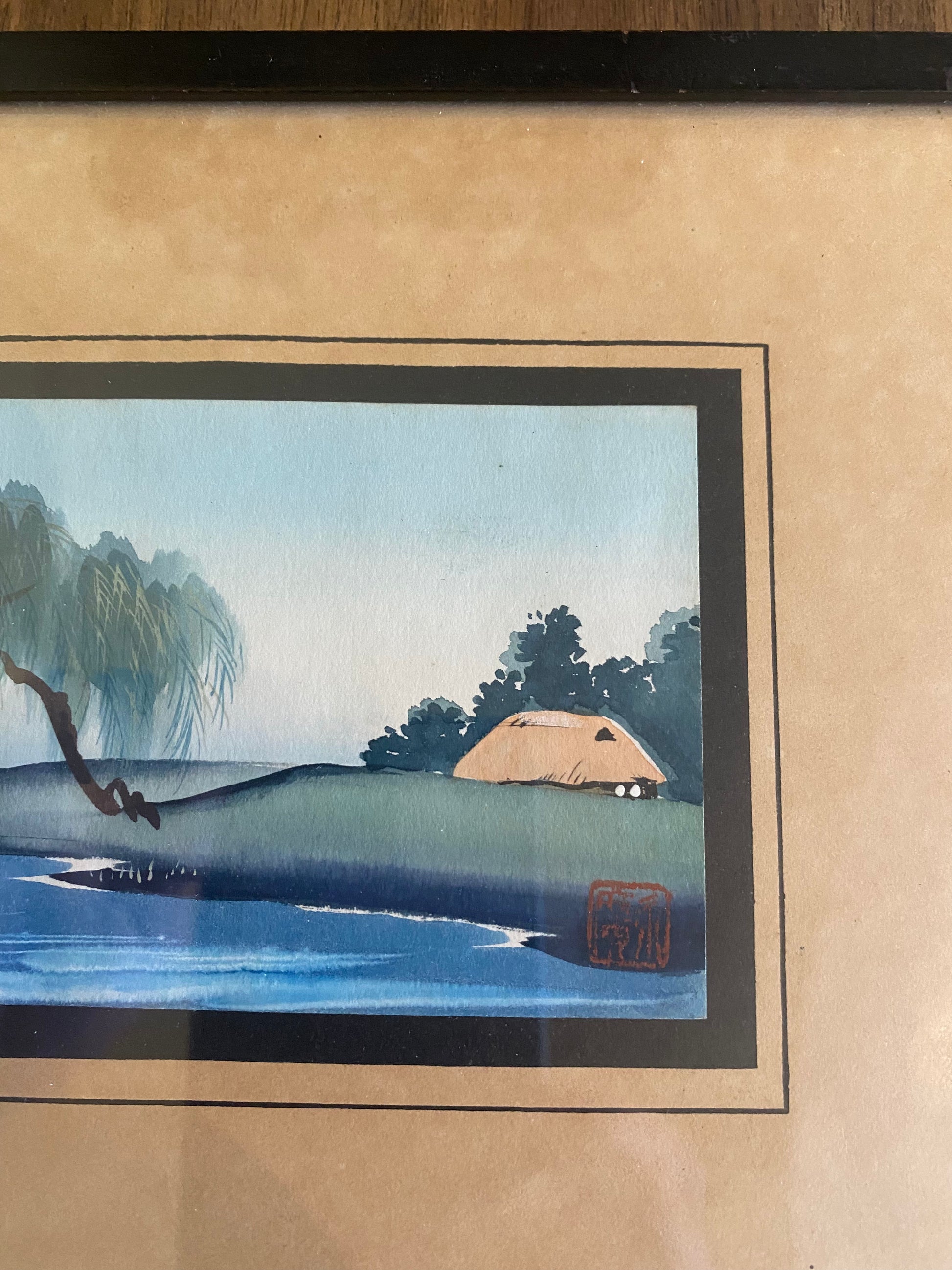 Japanese framed watercolour art of flying birds and willow tree from Matsumoto studio from early 1930s. Signed Matsumoto