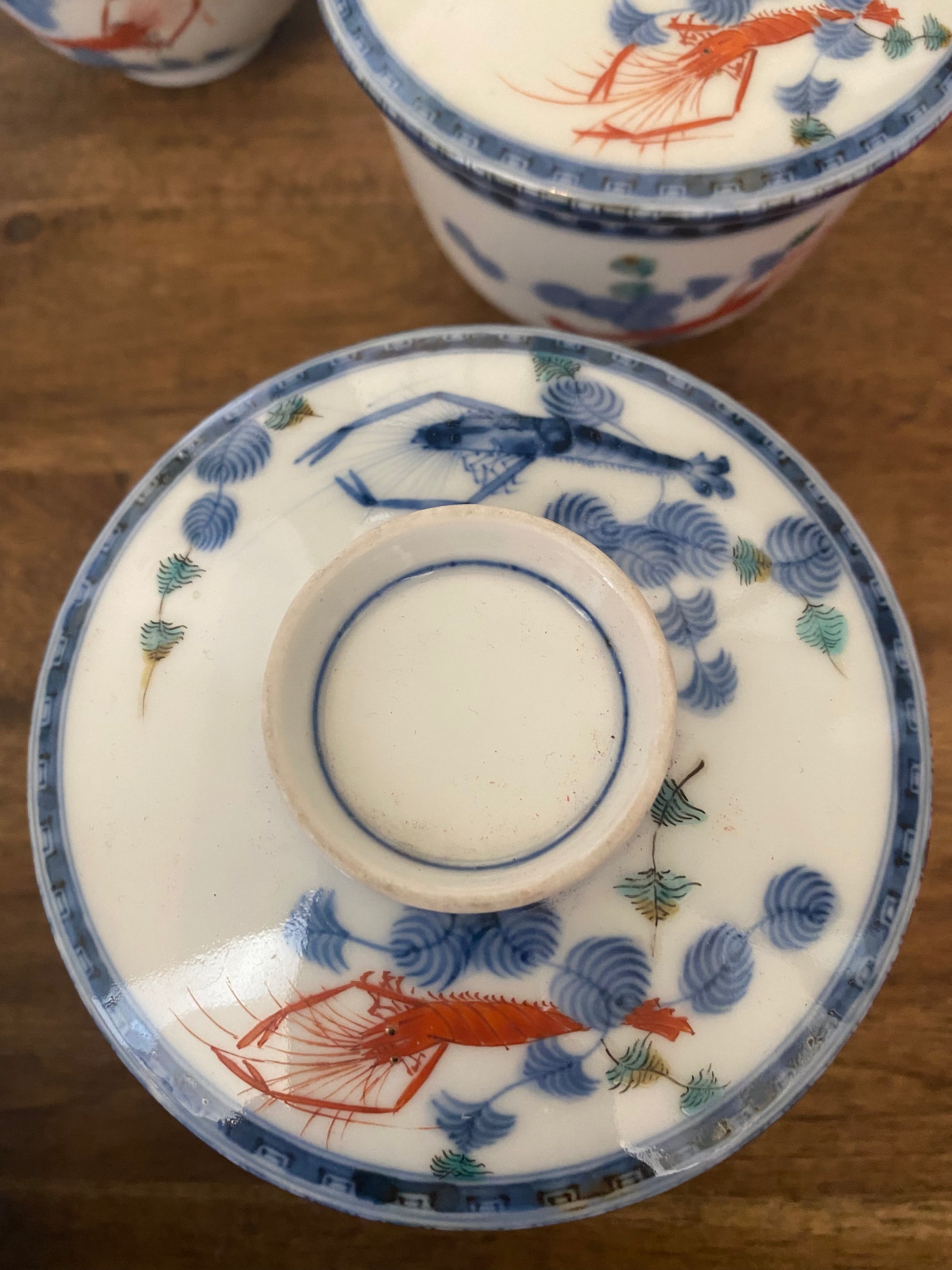 Japanese Kakiemon lidded bowl set of 5. Outstanding rare set with original box by famous Sakaido Kakiemon 12th (1878-1963) Depicting rare crustian decorations