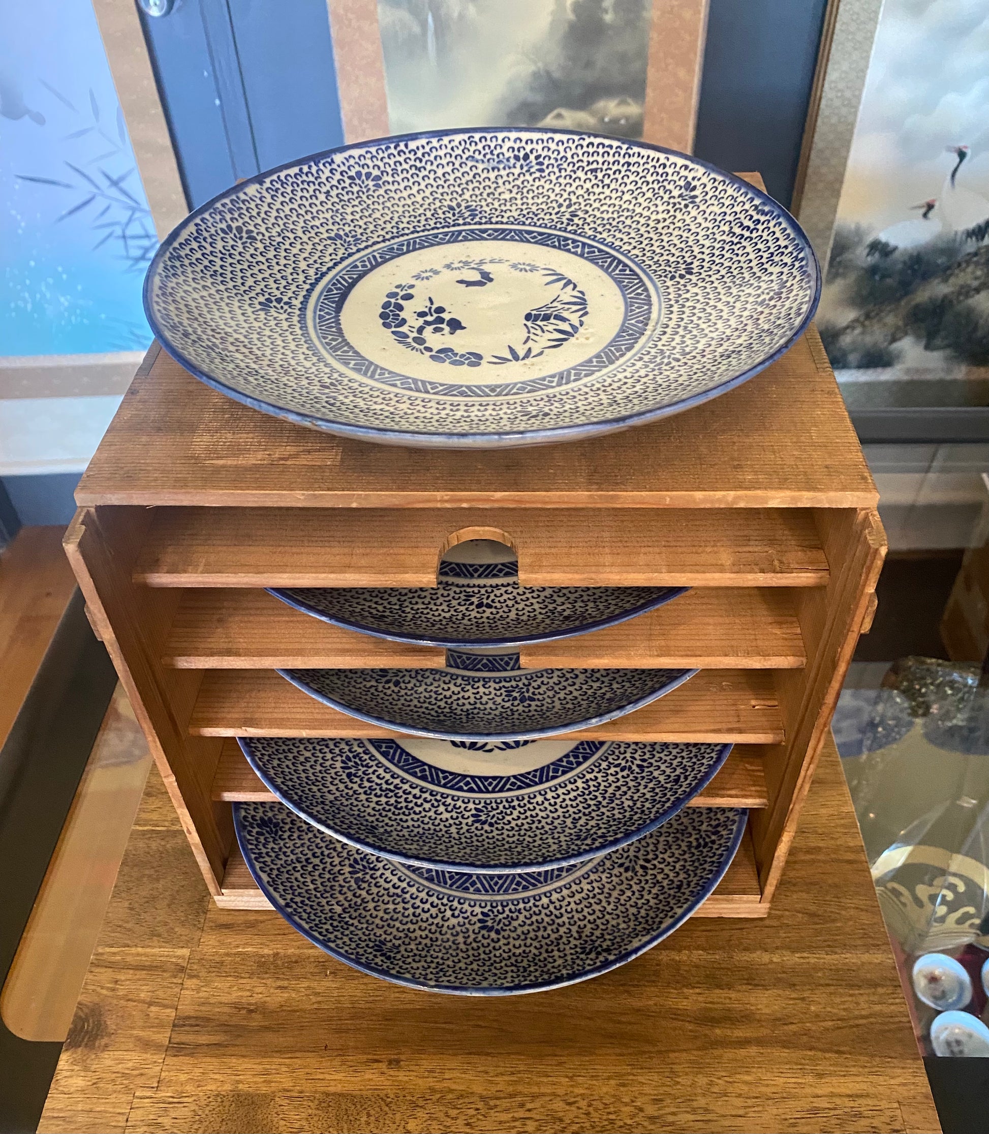 Japanese Ko-Imari blue and white plate set (5) with original wooden box from Meiji period. Circa 1880