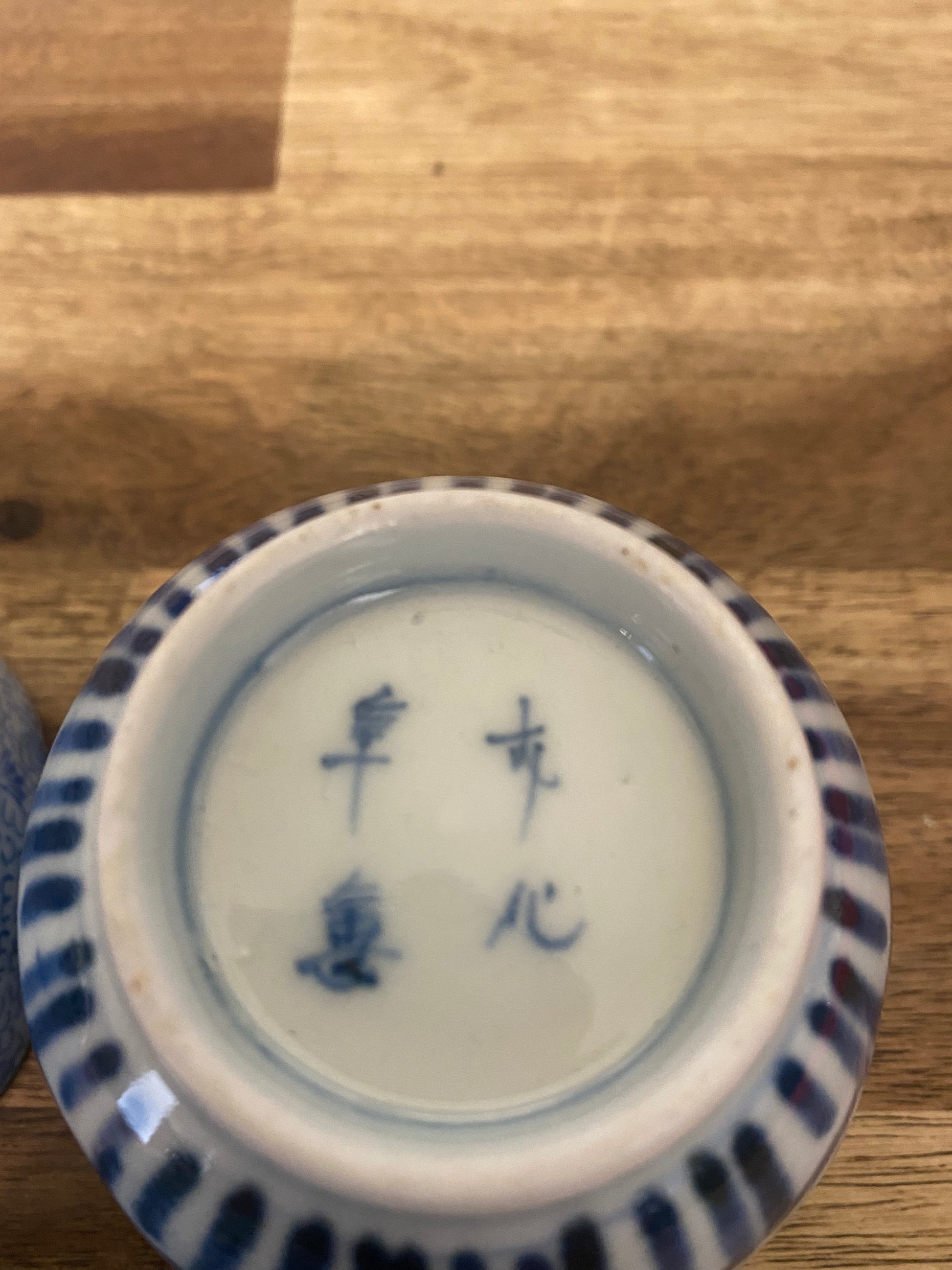 Japanese Ko-Imari blue and white soba cup and dish set (3) from Edo period. Signed circa 1820