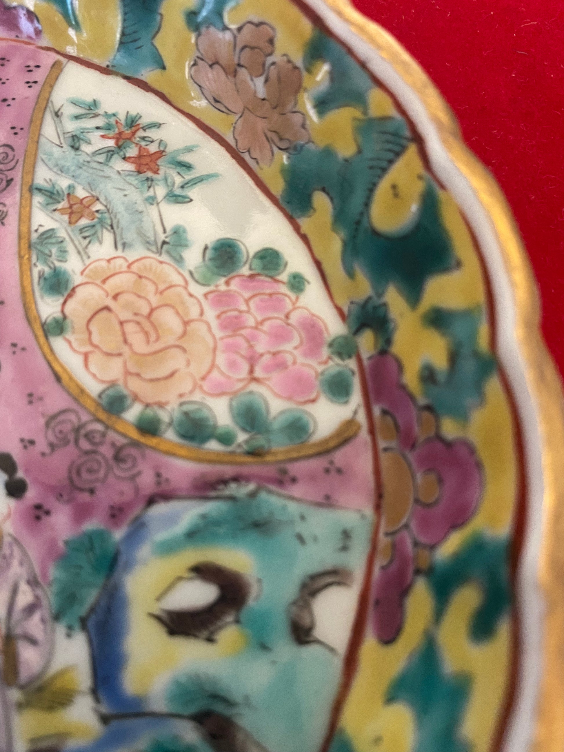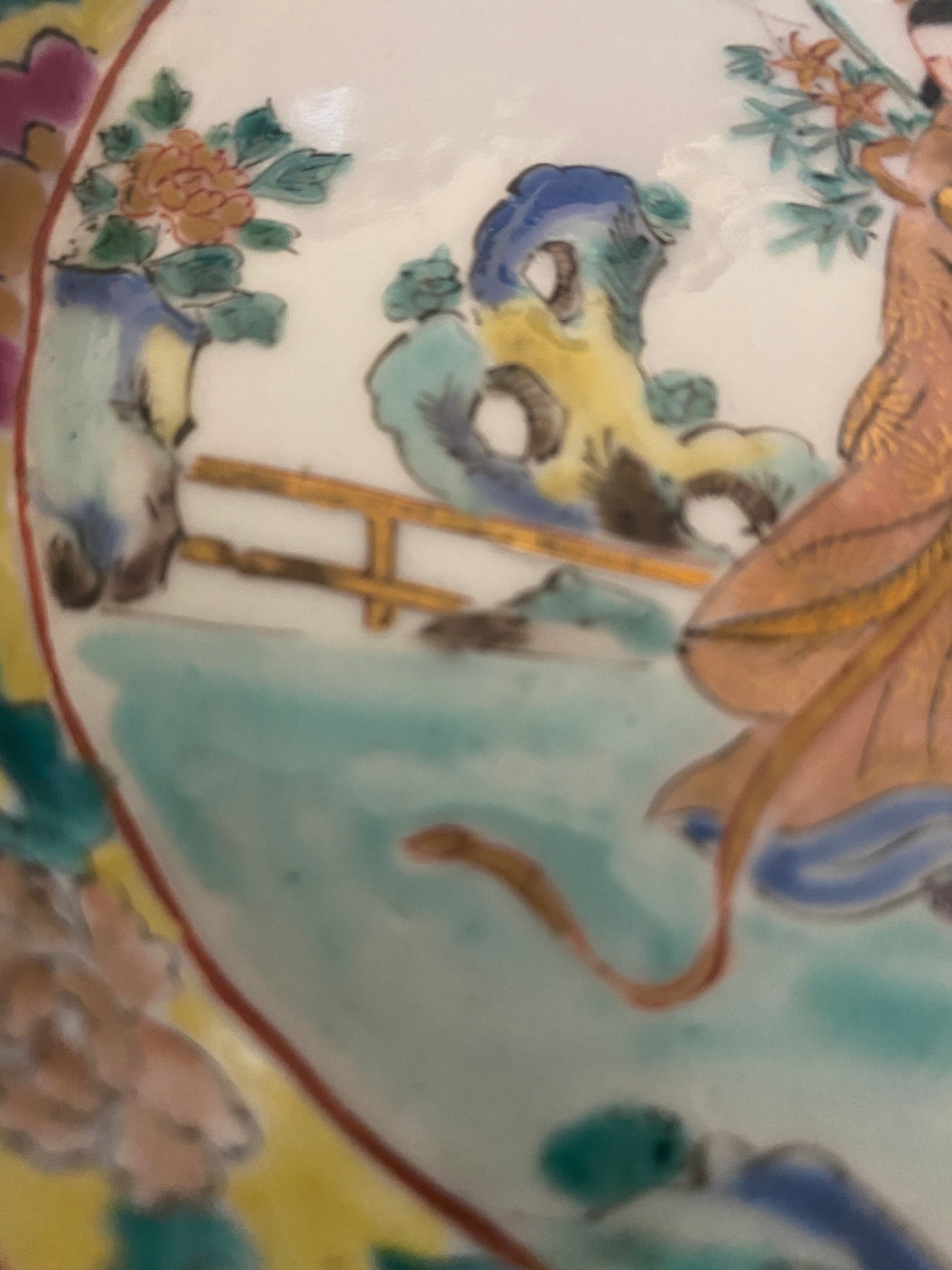 Japanese Kutani dish depicting woman and child with flowers and tree from Meiji period. Signed Kutani circa 1900.
