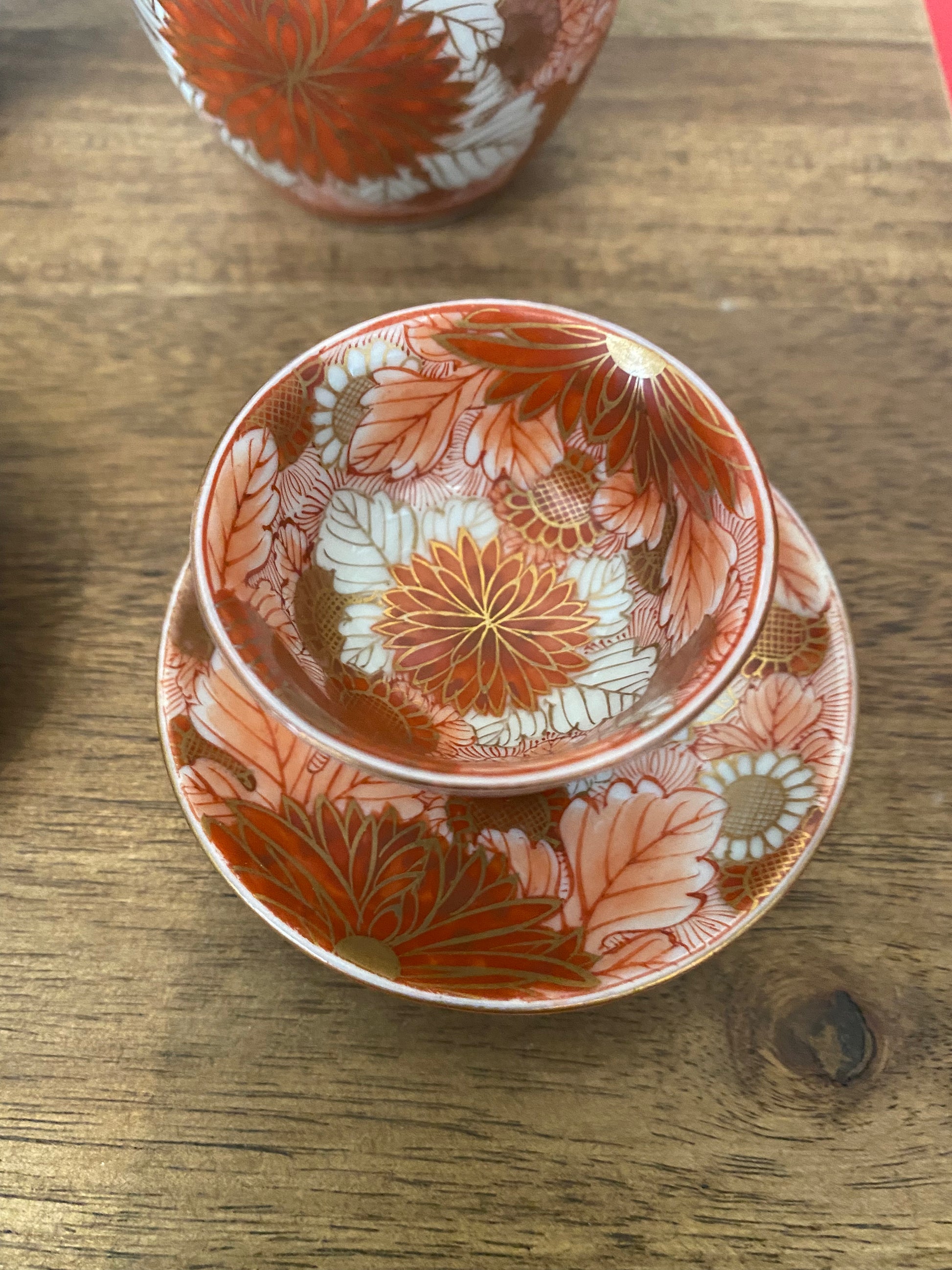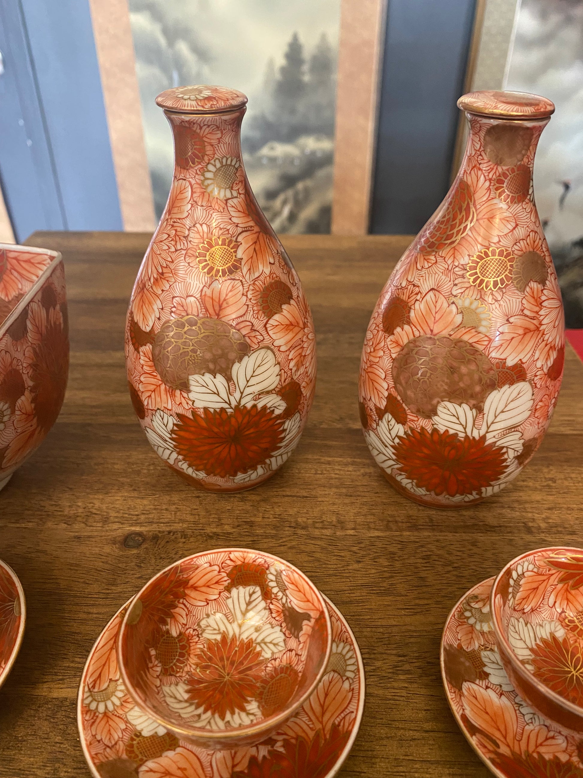 Outstanding Japanese Kutani sake set (15 pieces) decorated with elaborate flower decorations. Signed Kutani circa 1970s
