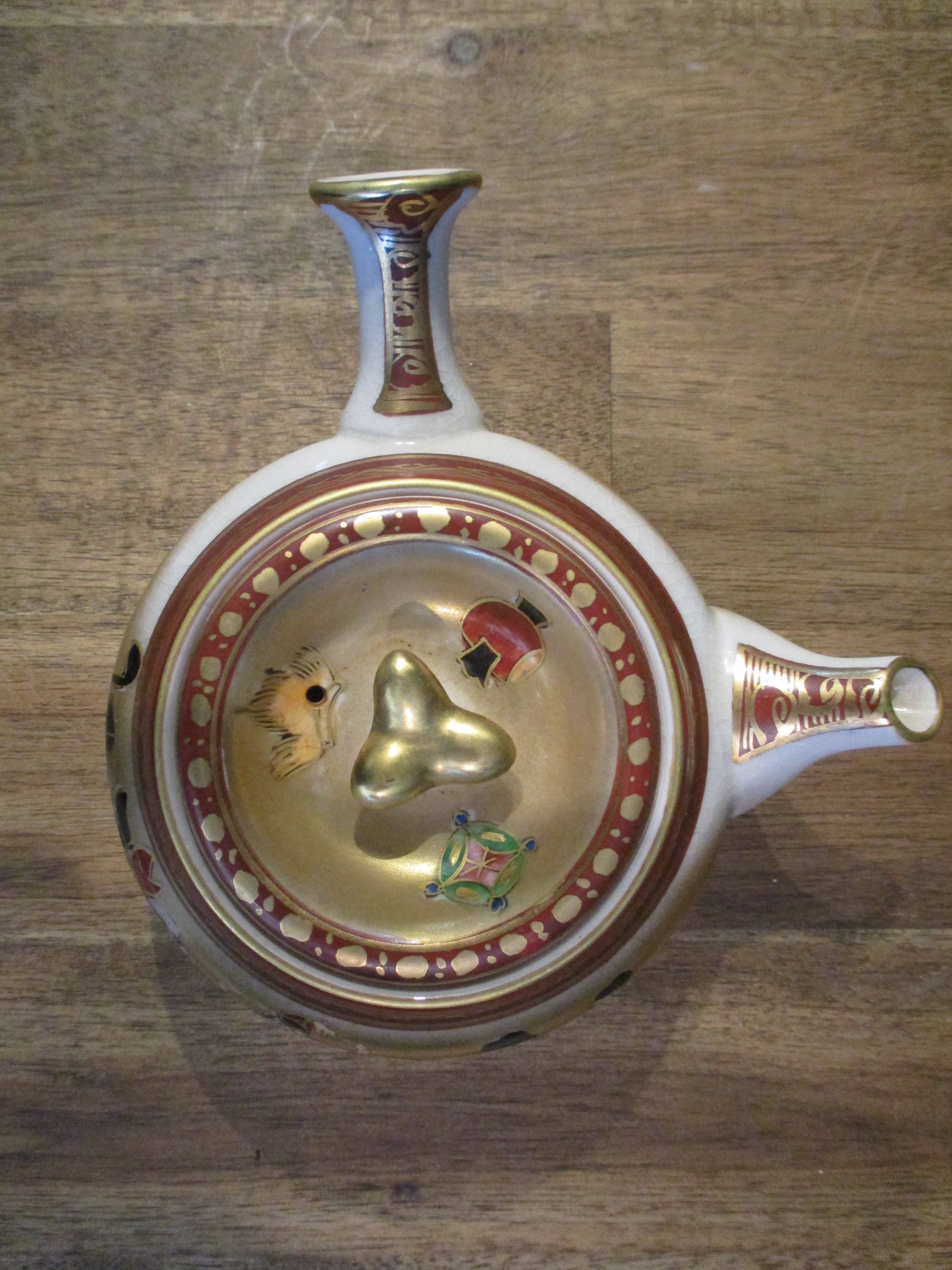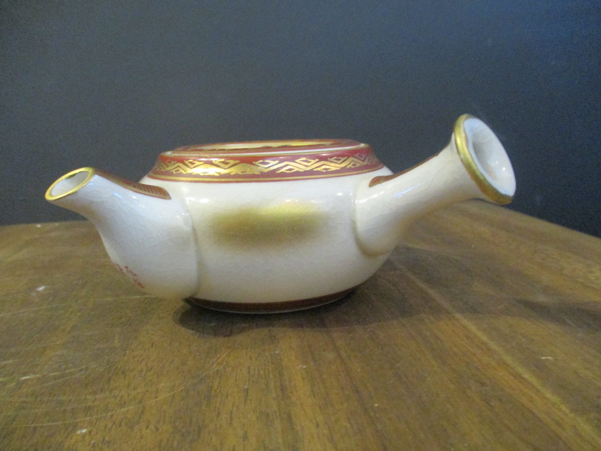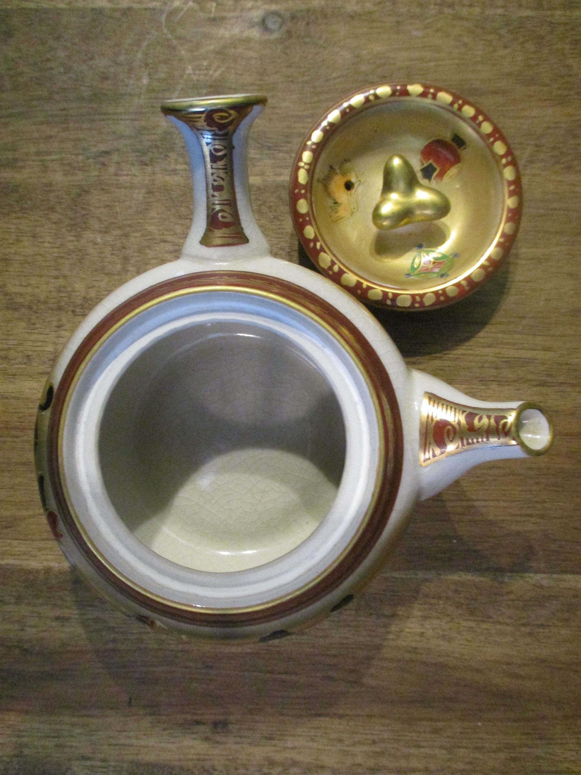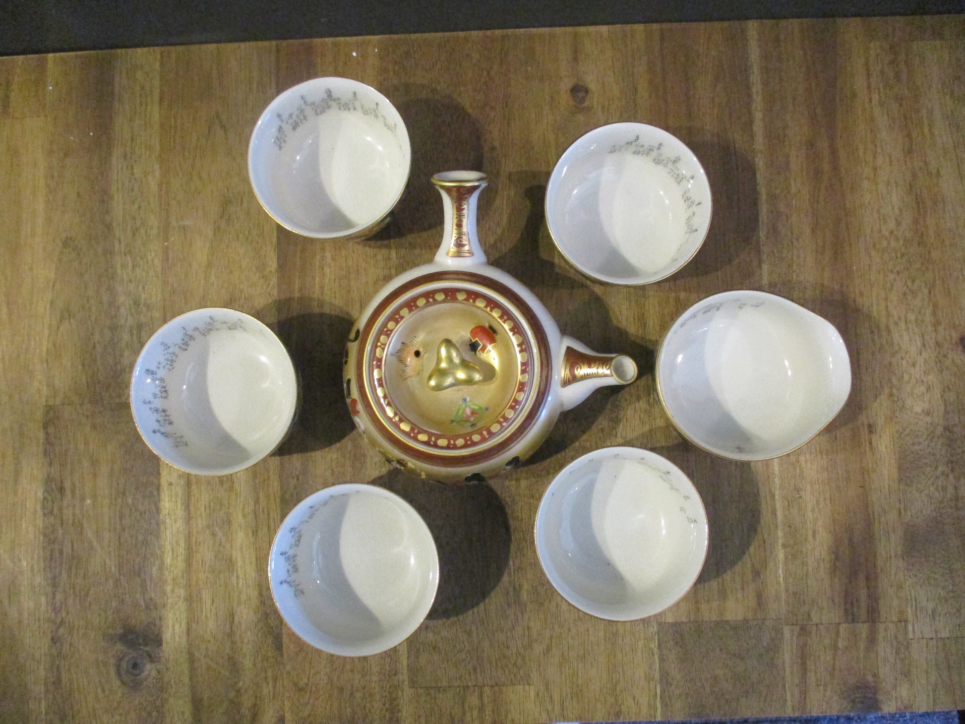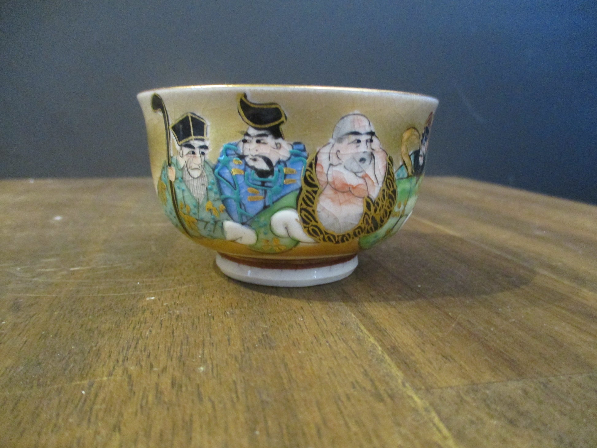 7 Piece Kutani Tea set depicting the 7 Gods of Good Fortune plus calligraphy inside cups.