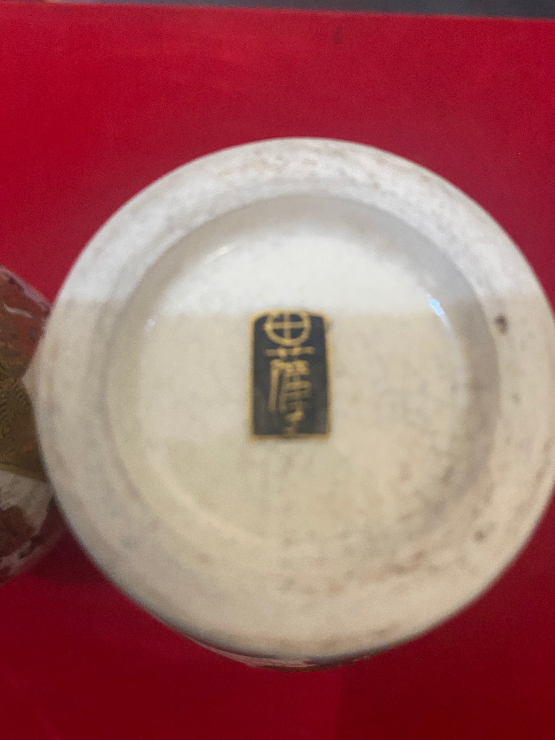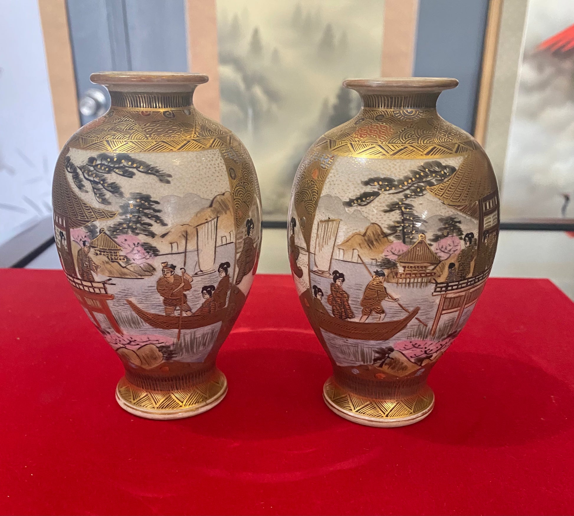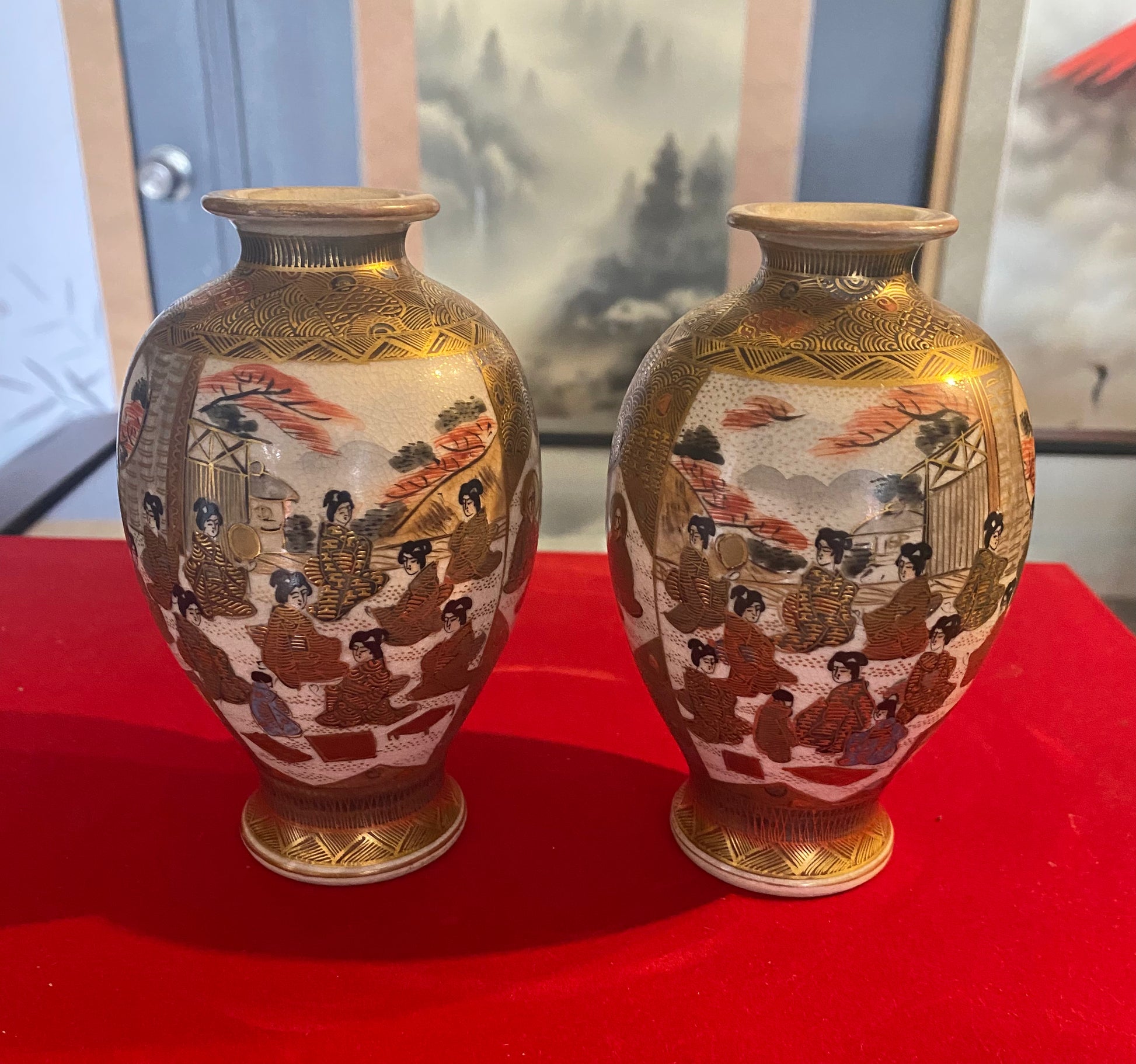 Japanese Satsuma mirror pair of vases depicting elaborate scenes of men, women and children from Meiji period. Signed satsuma circa 1890
