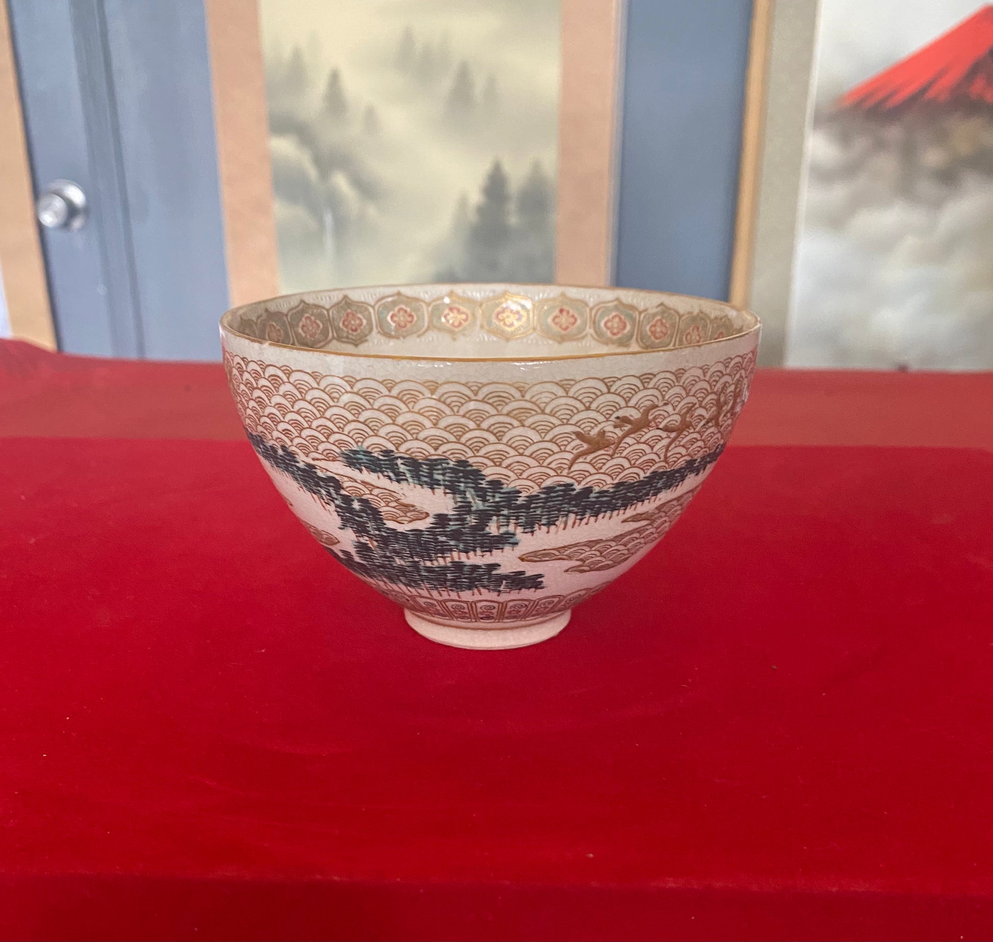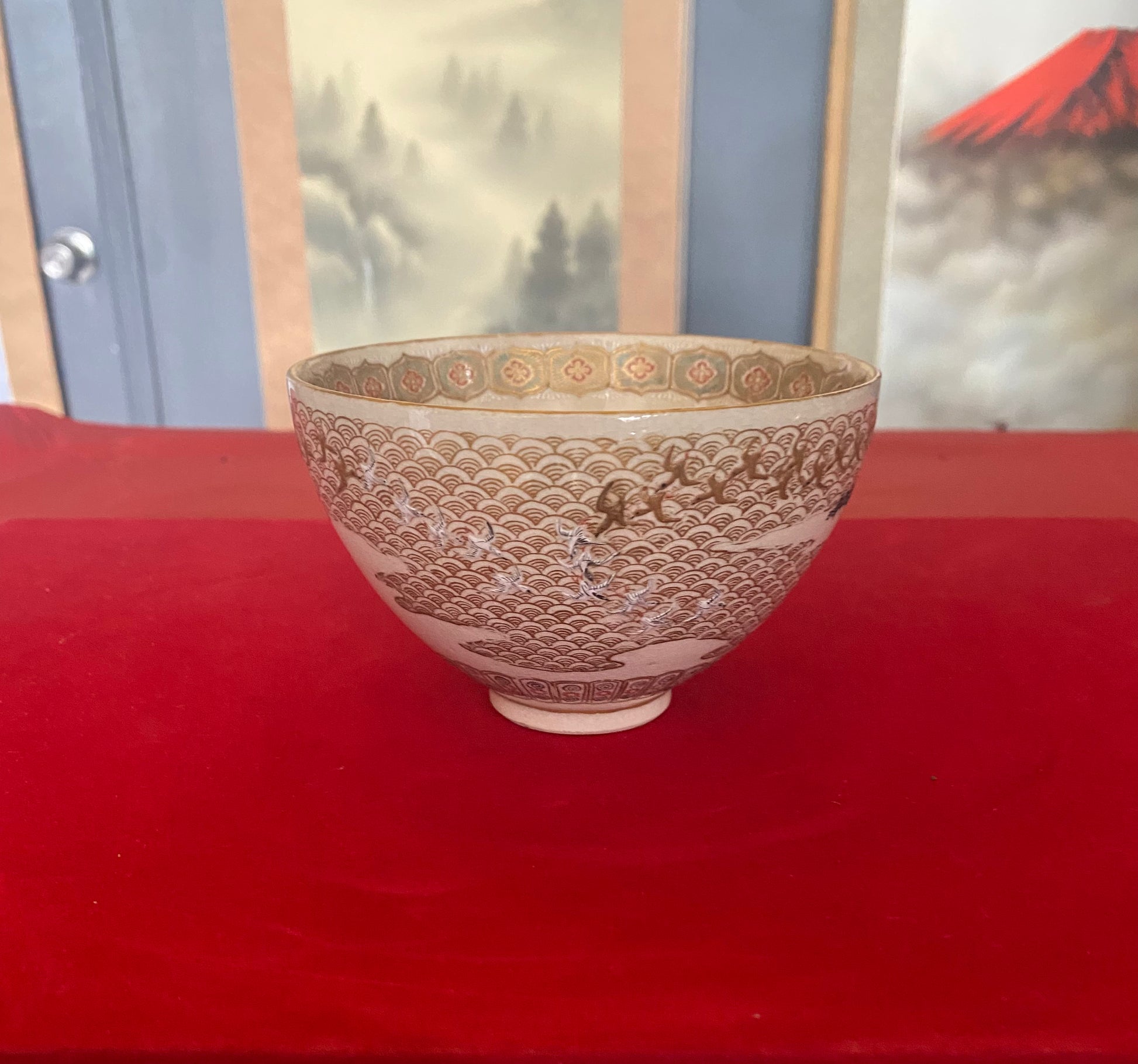 Outstanding Japanese Satsuma tea bowl depicting flying cranes and pine trees from late Edo period. circa 1860
