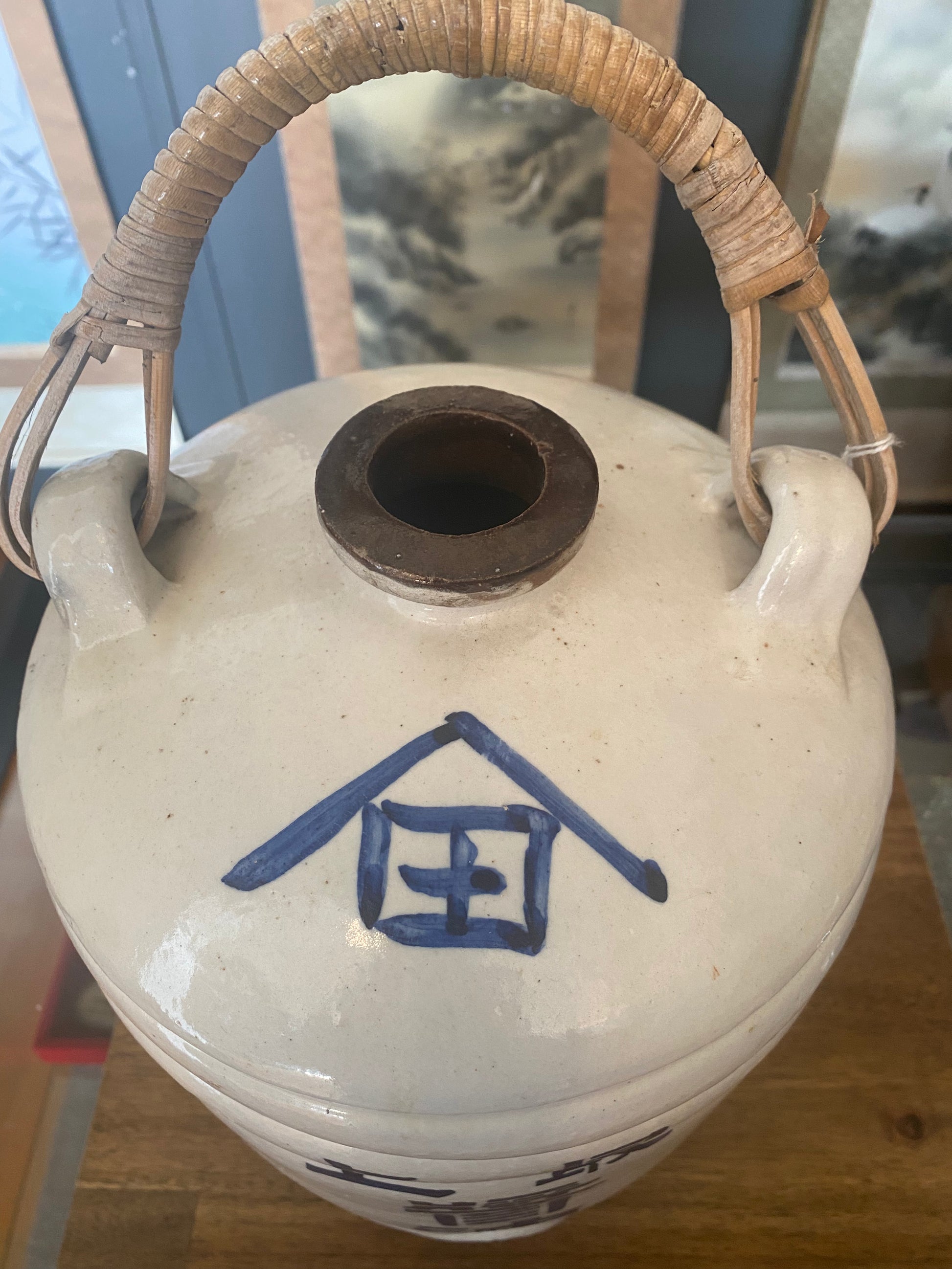 Japanese storage barrel and handle for soy sauce with company name on barrel from Meiji period circa 1910