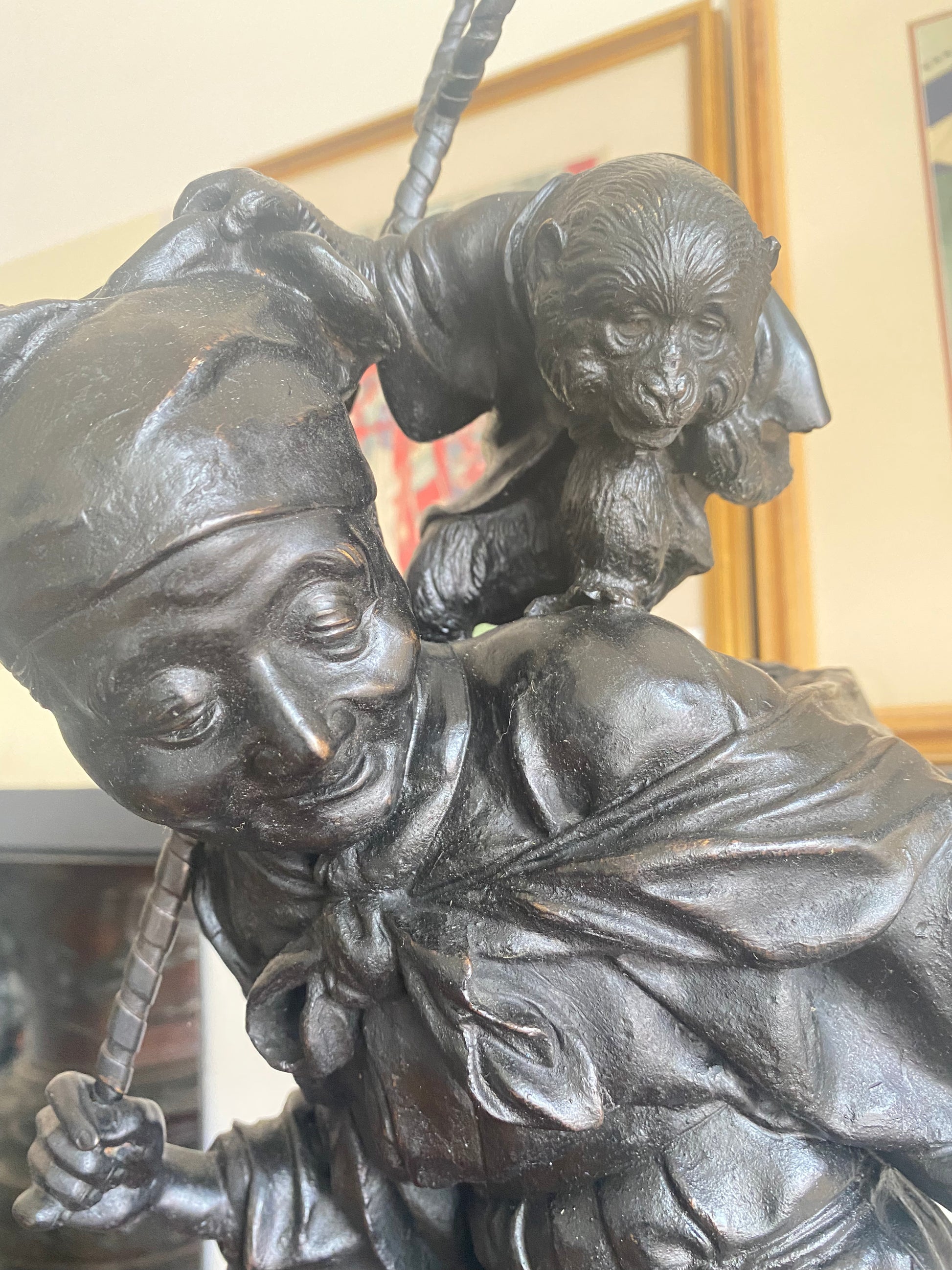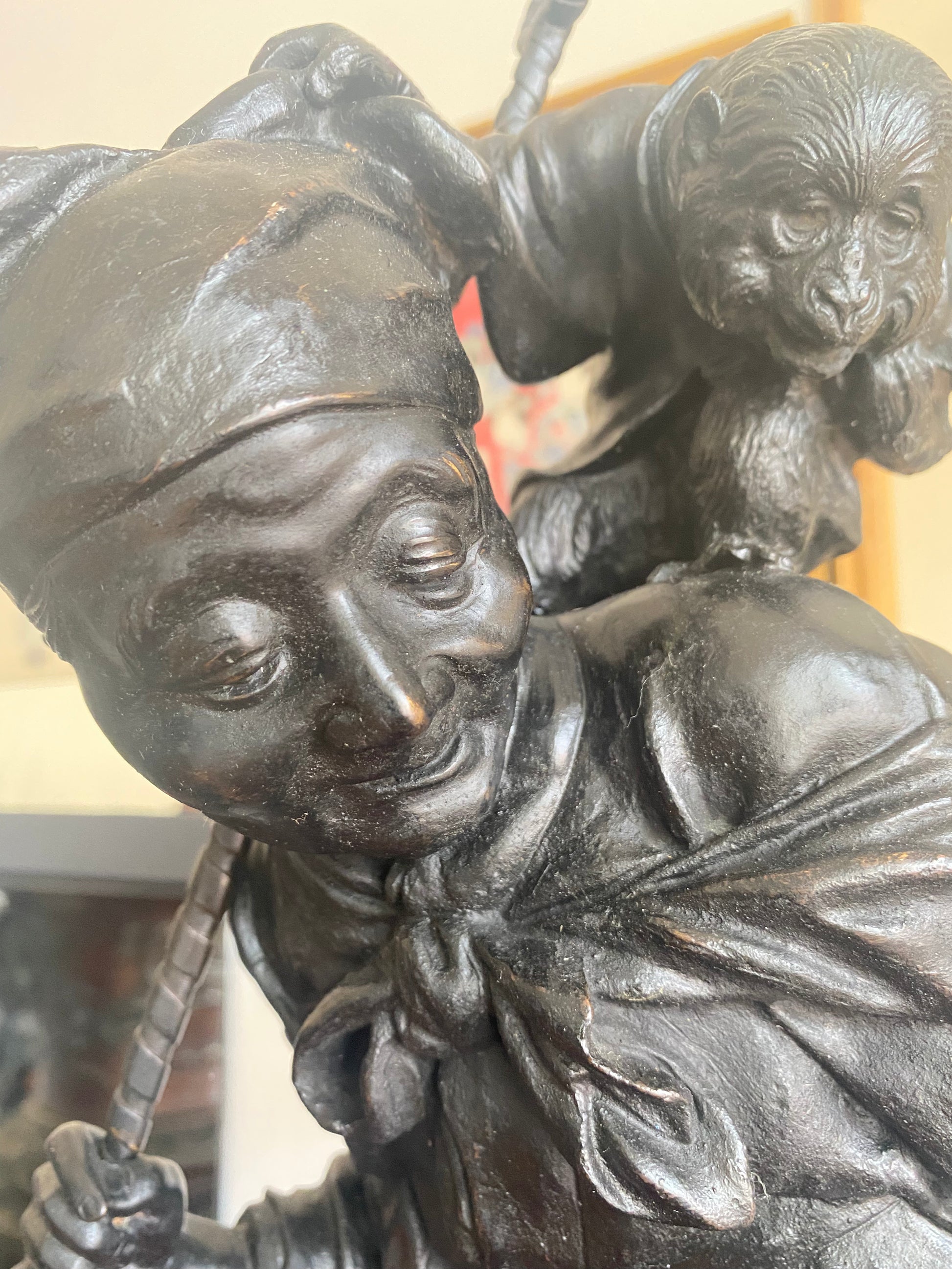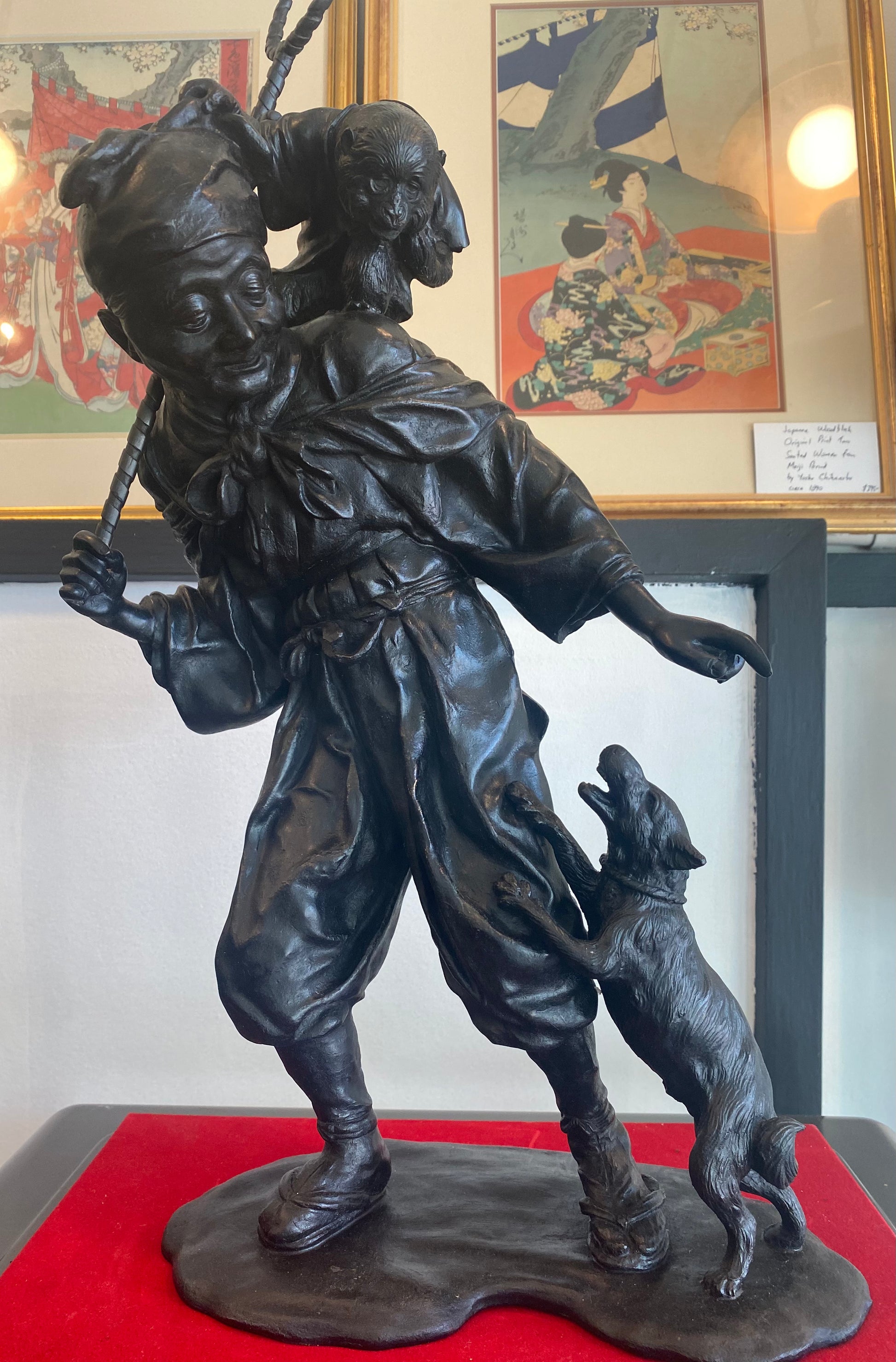 Outstanding museum quality Japanese bronze okimono entertainer with his monkey and dog from Meiji period. Signed circa 1880.