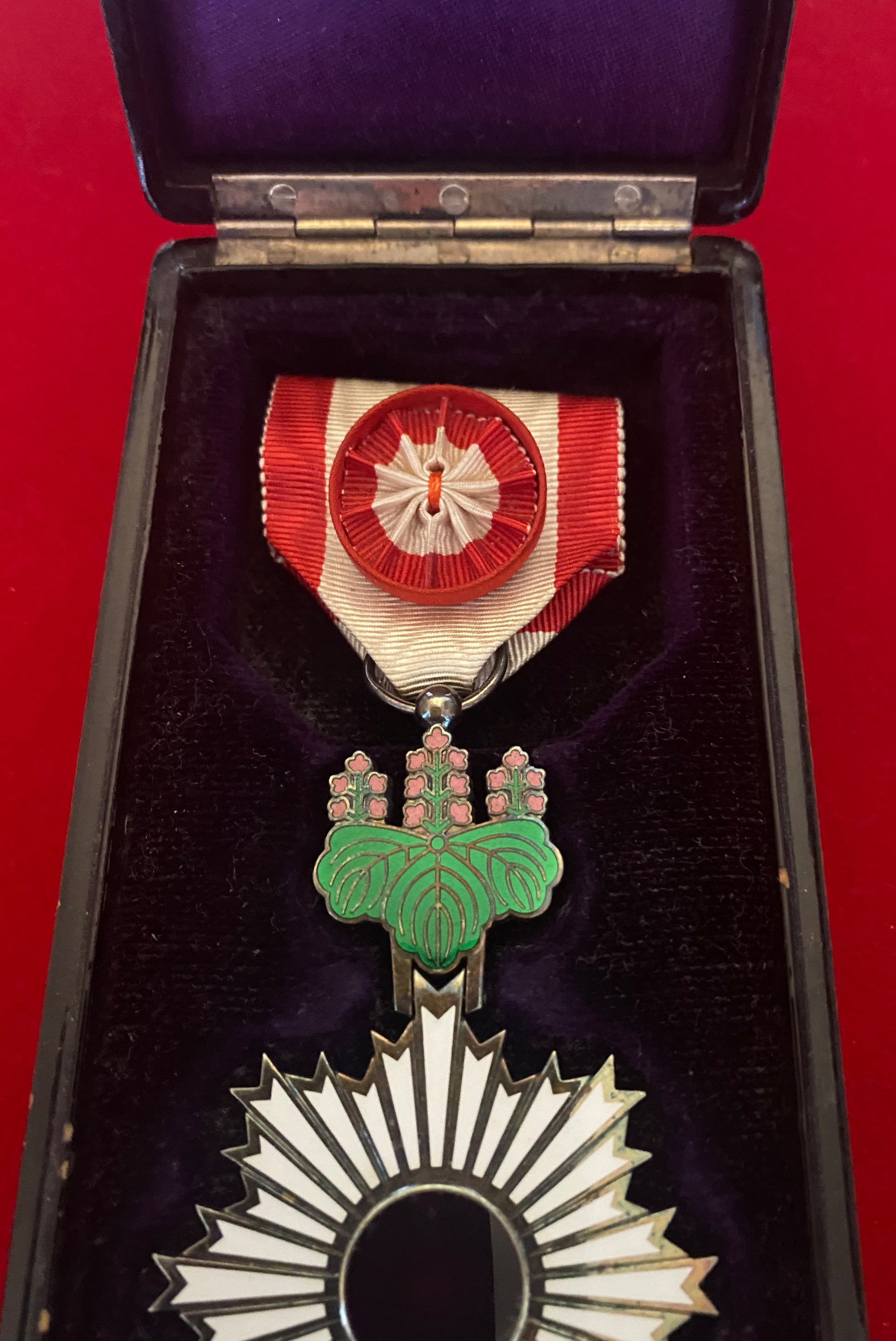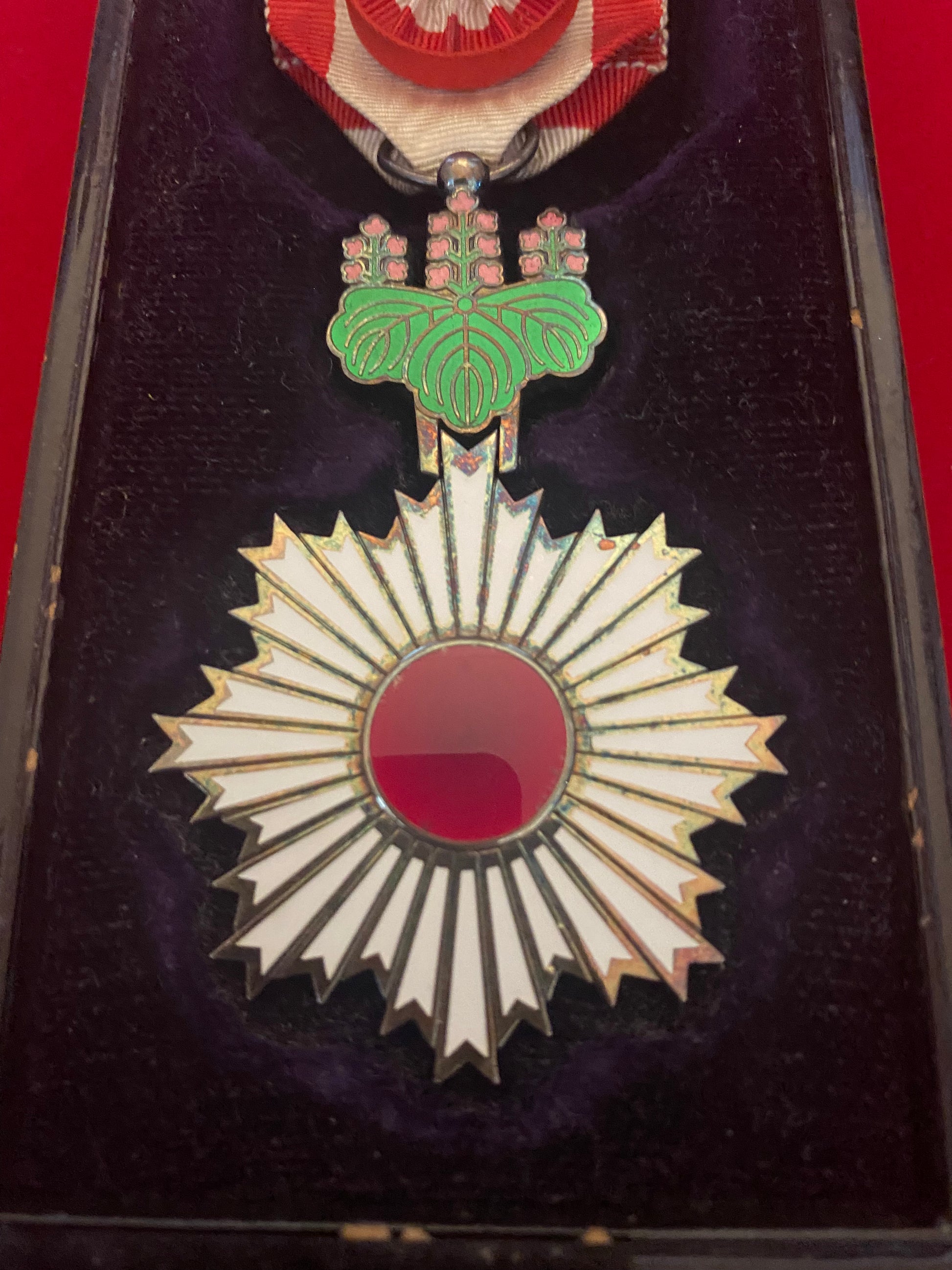 Cased order of the rising sun 4th class. The order of the rising sun (Kyokujitsushu) established in 1875 as Japan's first national decoration awarded to either military or civilian personnel for meriturious service. Sterling silver and white enamel circa 1920s