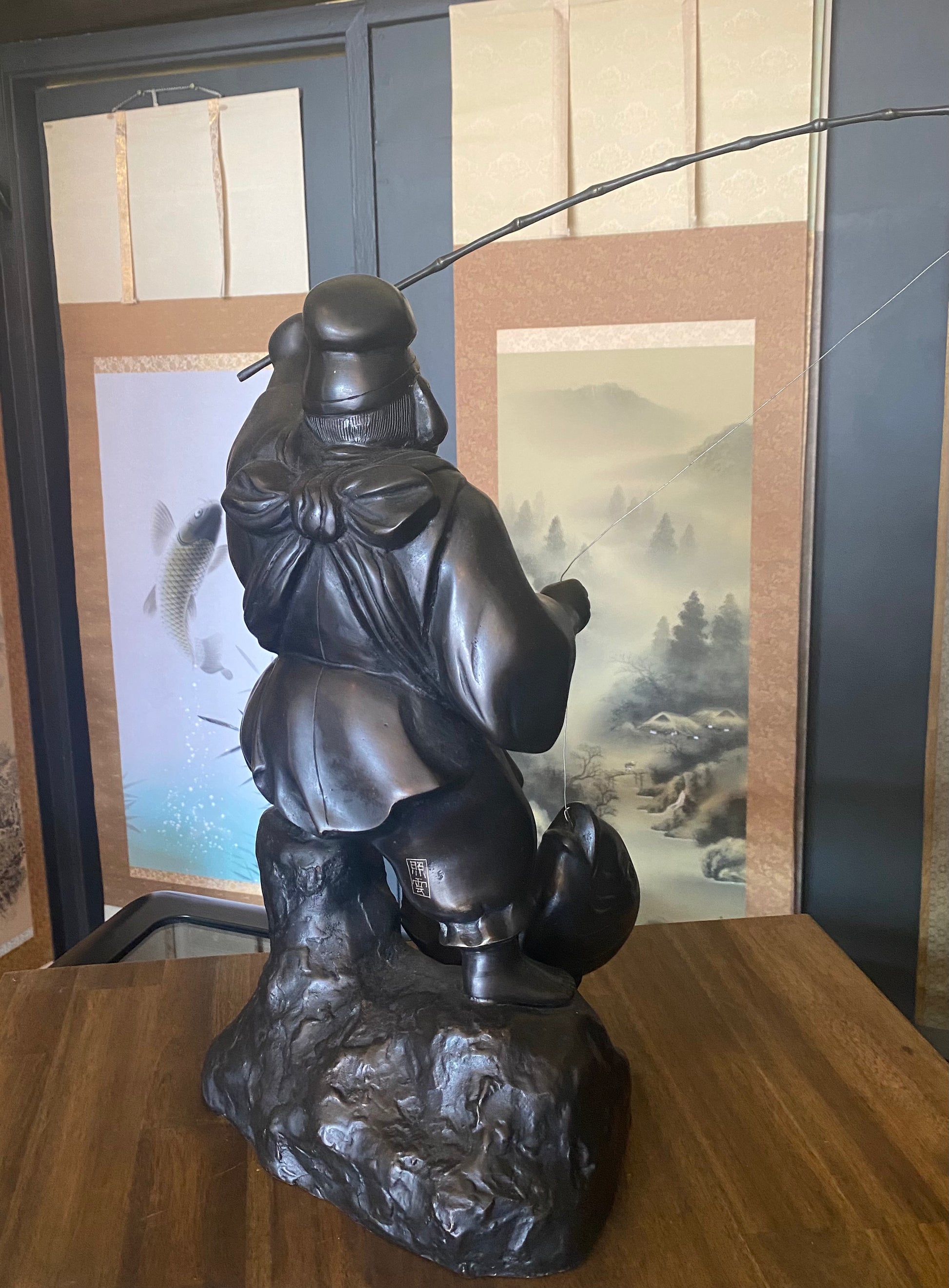 Outstanding Japanese bronze Okimono Ebisu patron god of fishermen and tradesmen with fishing rod and fish from late Meiji period. Signed circa 1910
