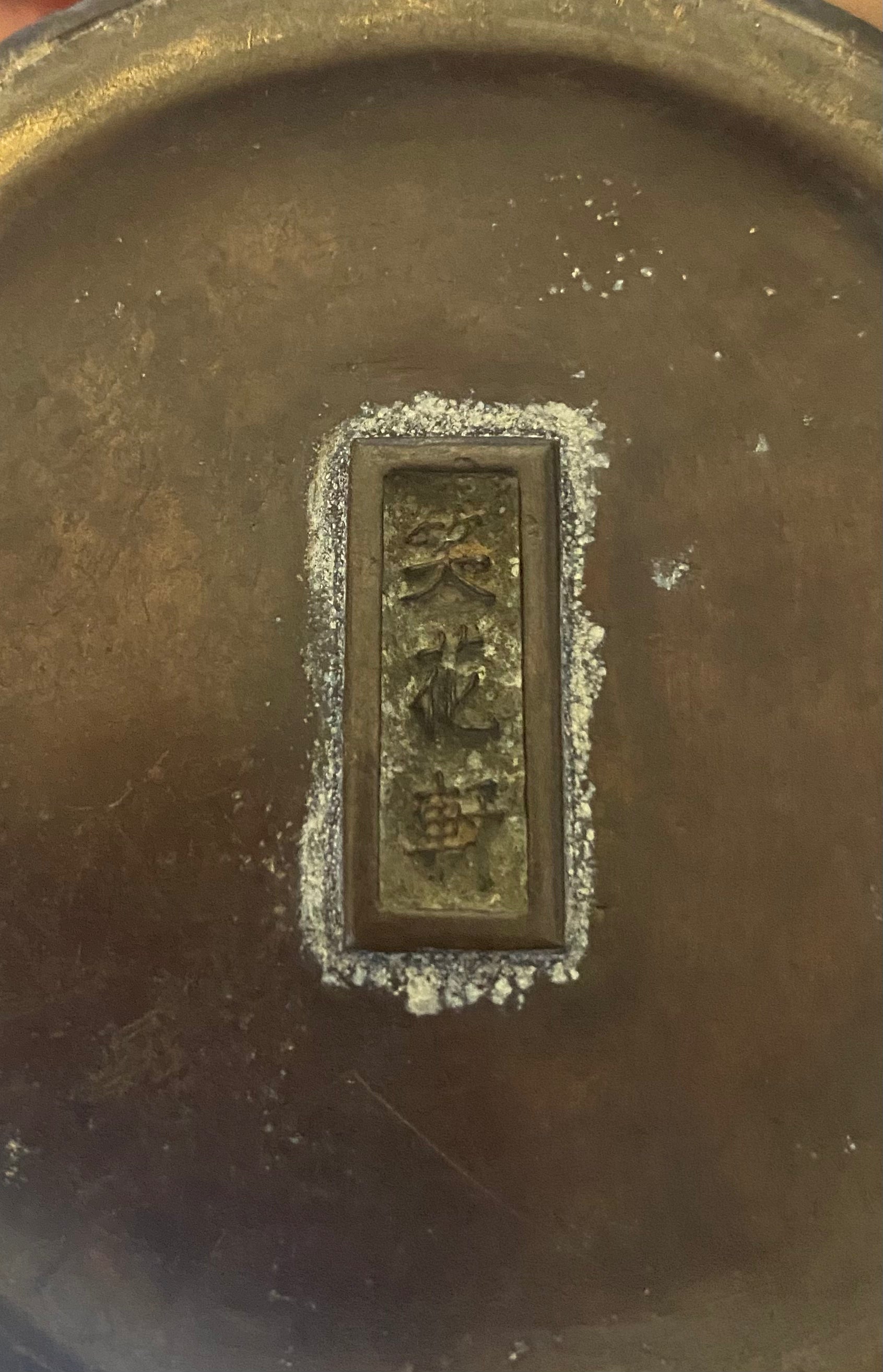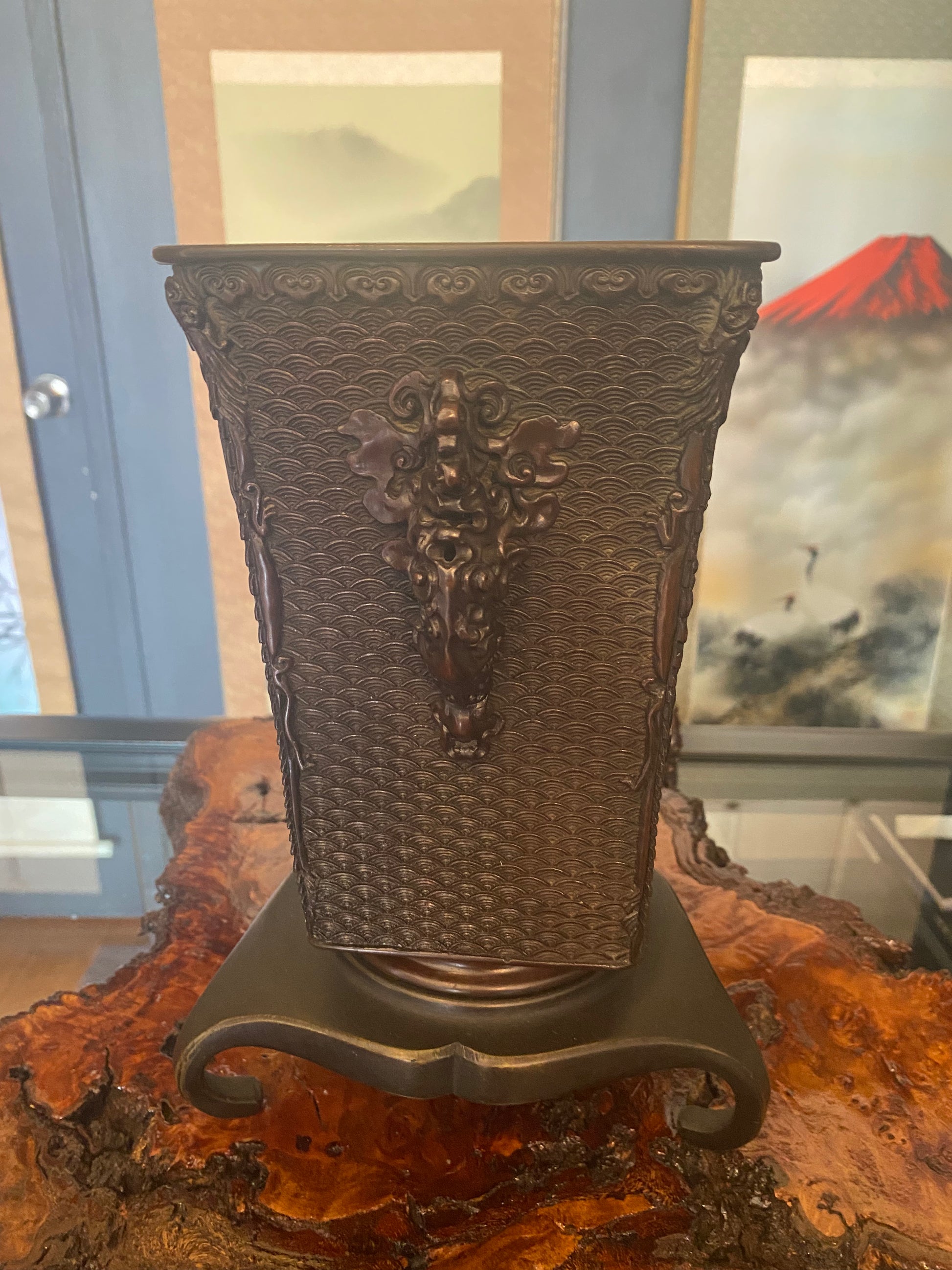 Important outstanding Japanese bronze vase and bronze stand in square shape depicting elaborate decorations of elders with floral handles from Meiji period. Signed Shokaken circa 1880.