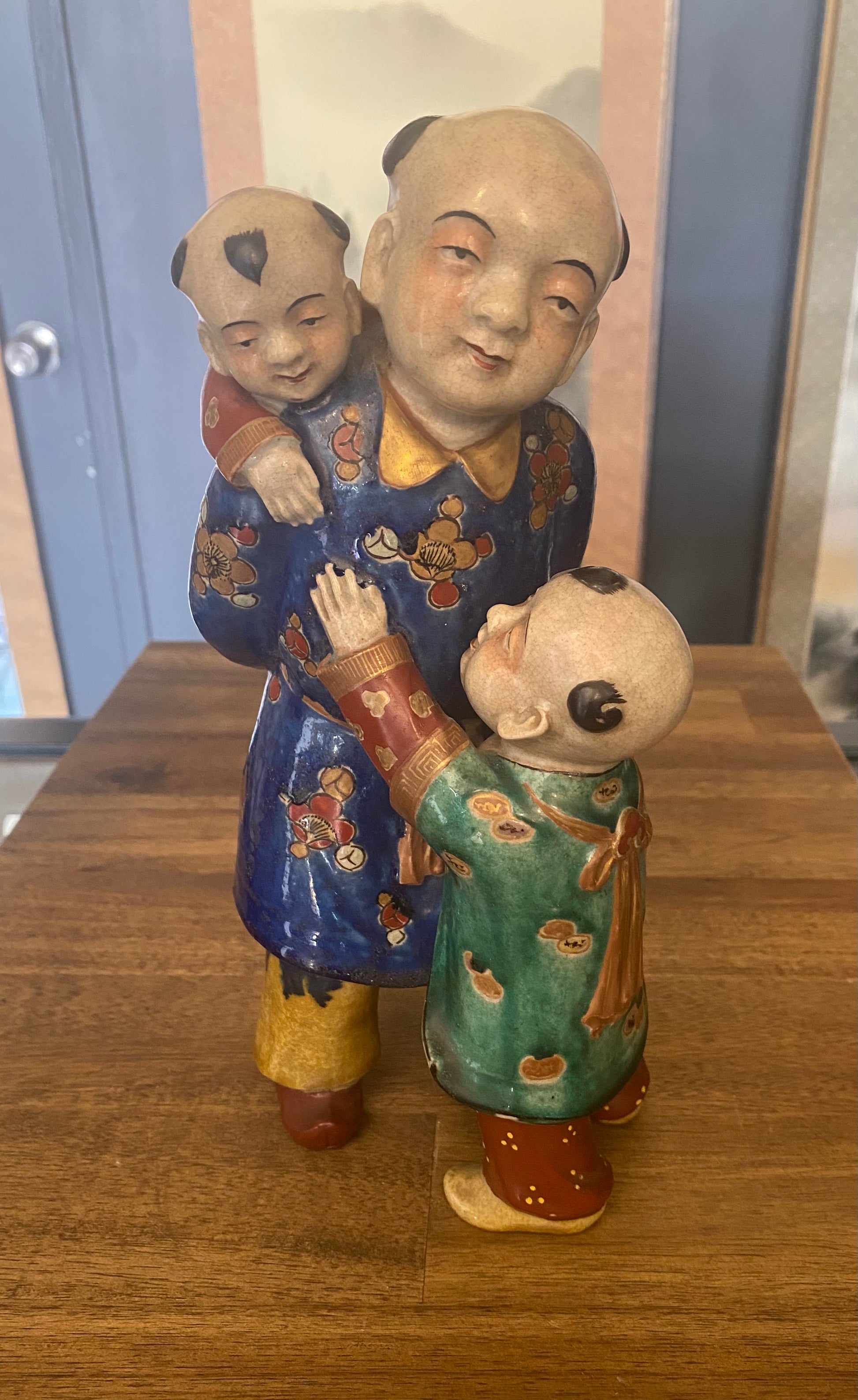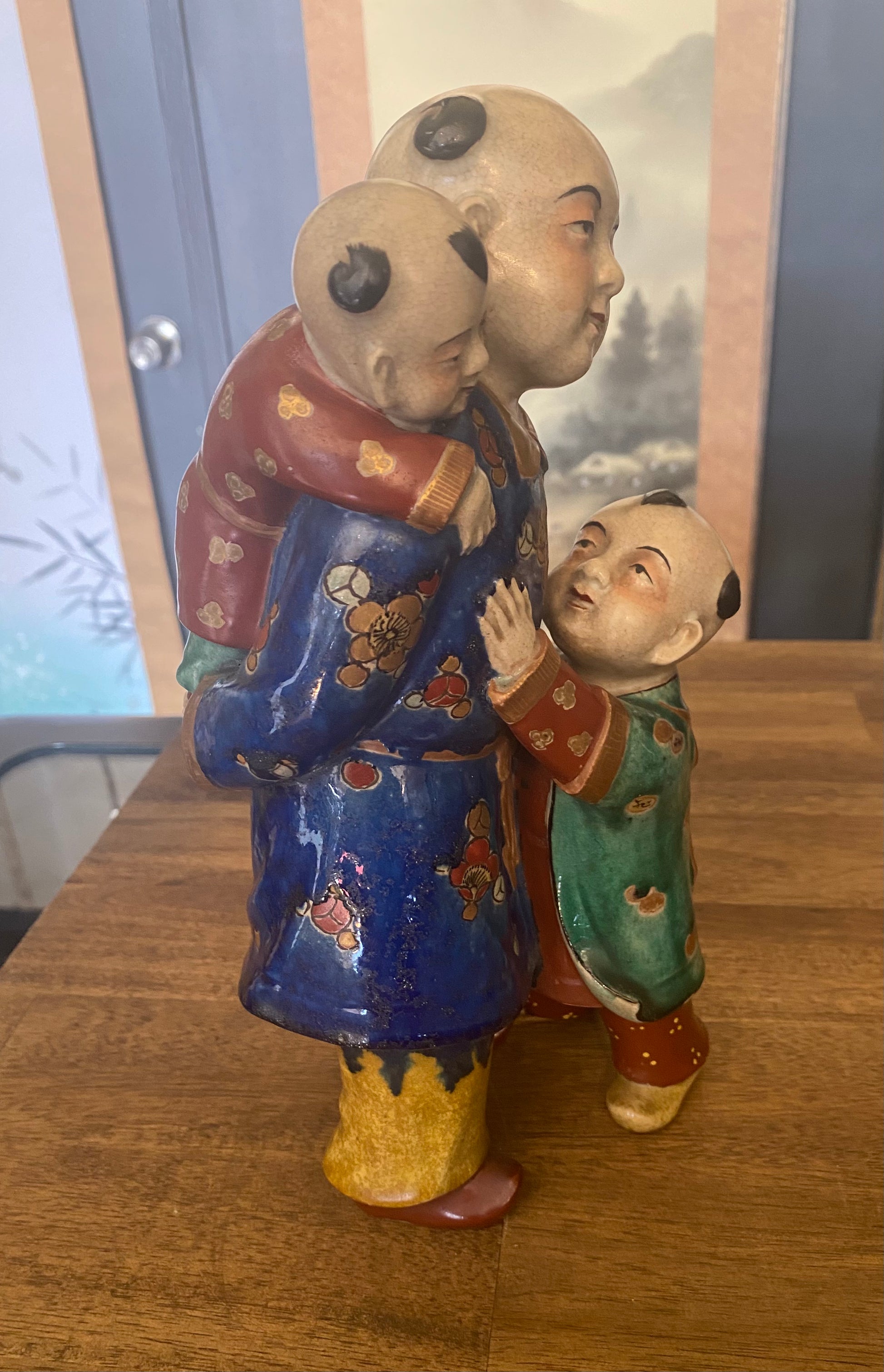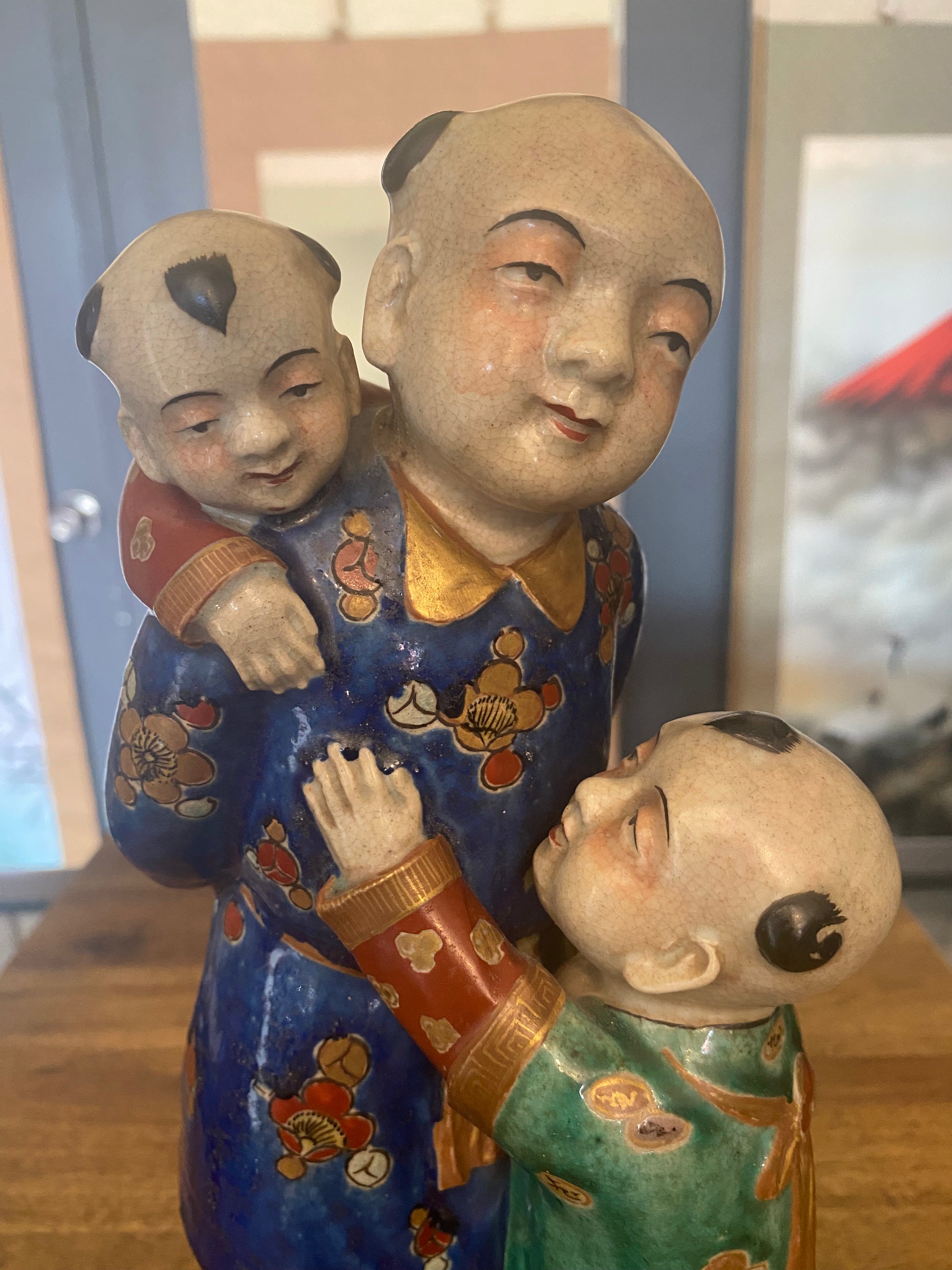 Outstanding rare Japanese Satsuma Okimono man and two children from Meiji period. Signed circa 1890.