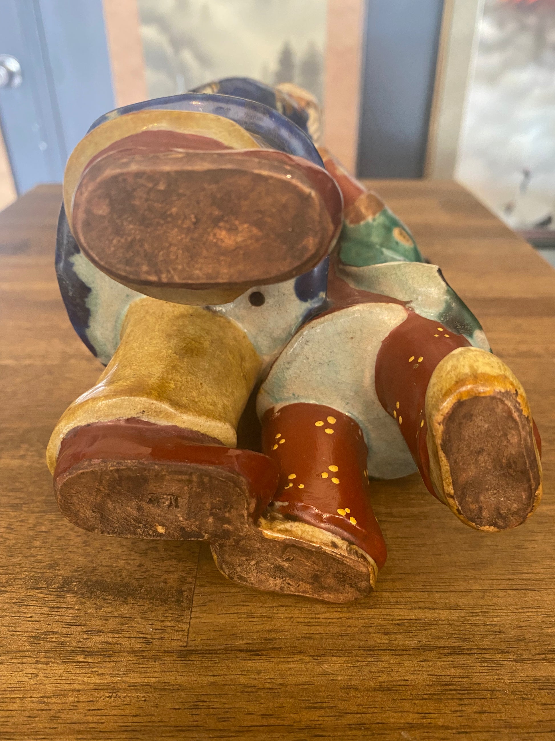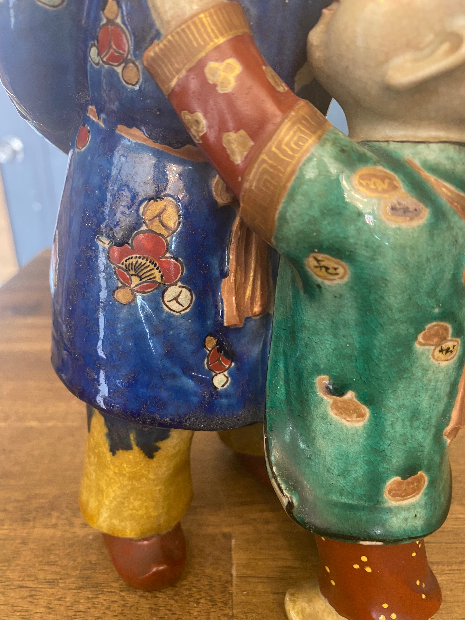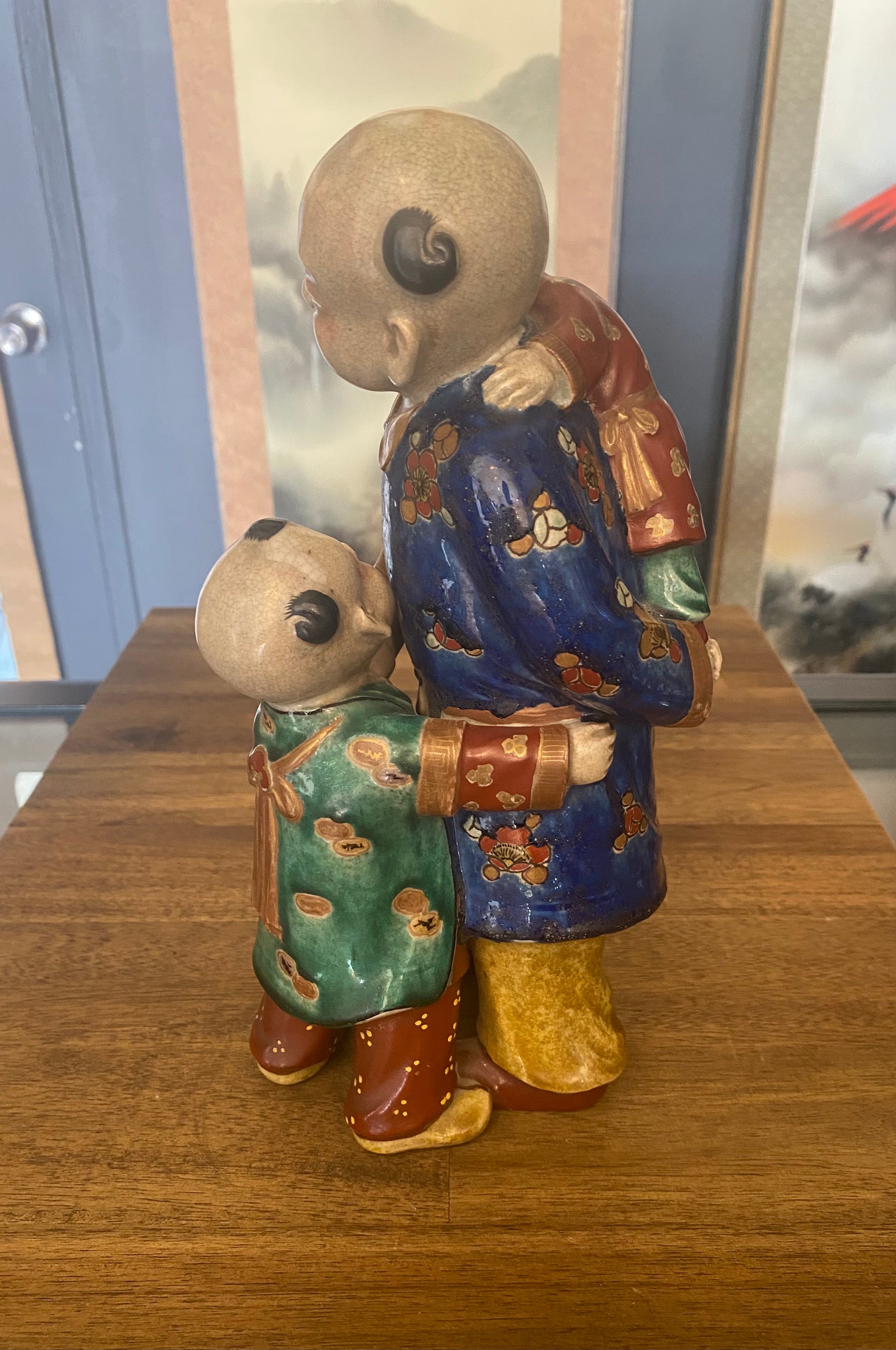Outstanding rare Japanese Satsuma Okimono man and two children from Meiji period. Signed circa 1890.